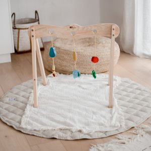 At what age can I use a wooden baby gym? You can use a wooden gym from day one! In the newborn stage (0-3 months), babies will simply gaze at the hanging toys, strengthening their vision. By 3-6 months, they will begin reaching and batting at the items.