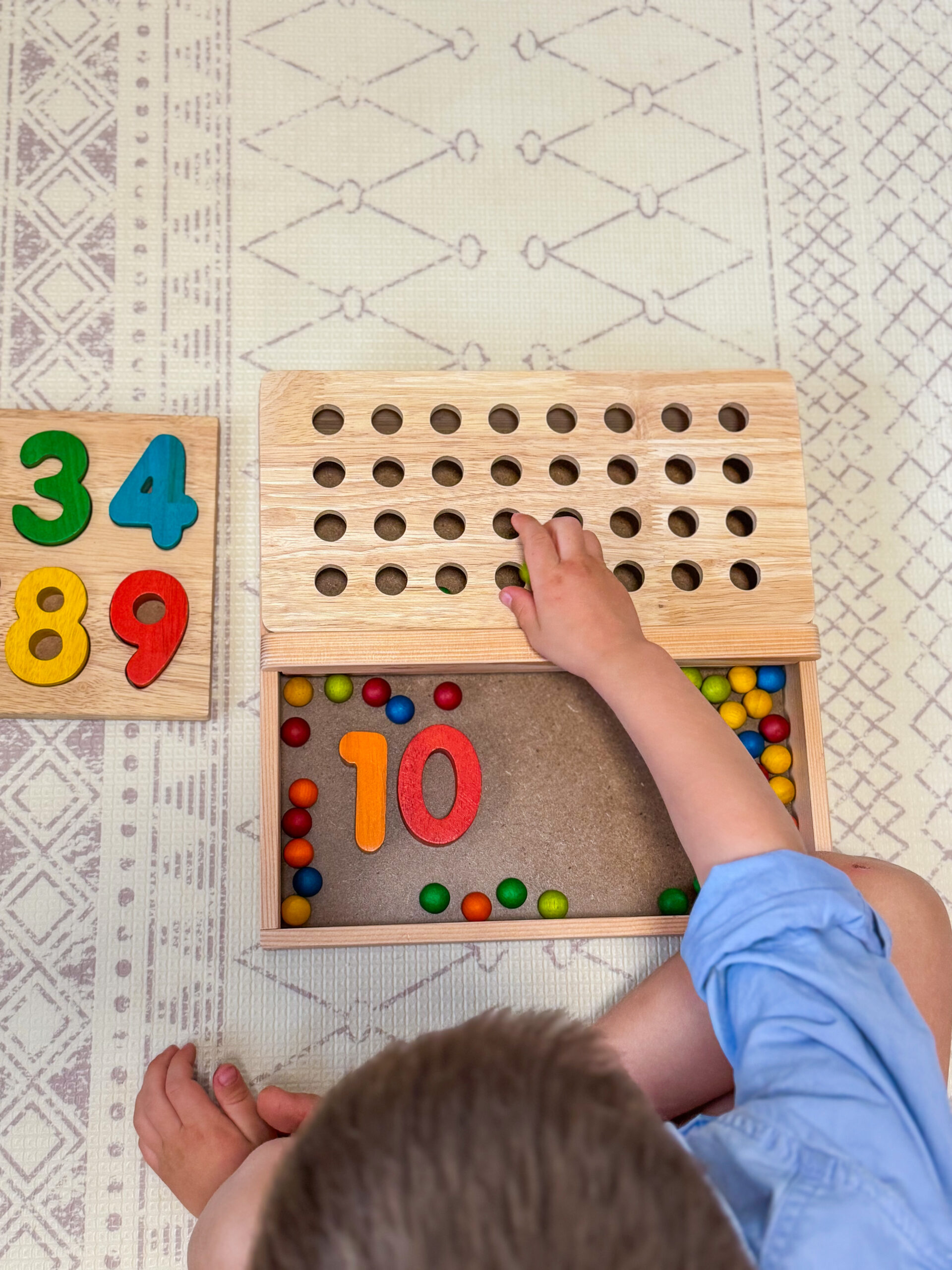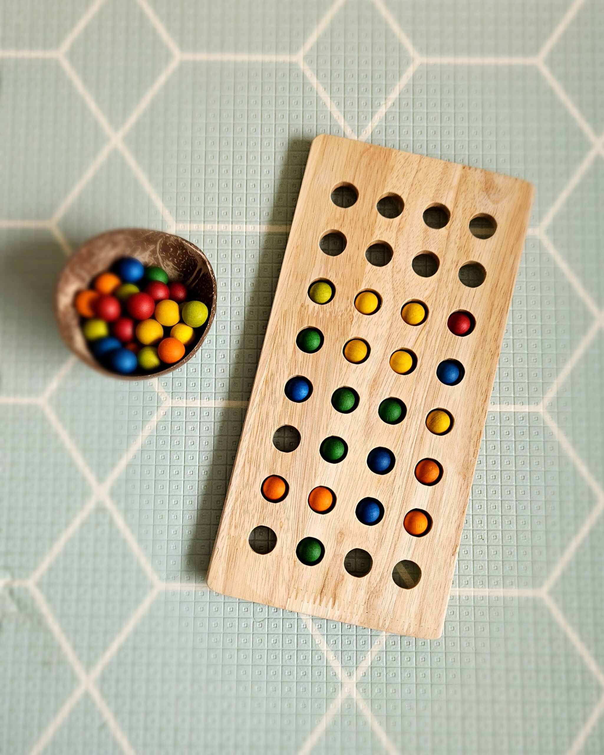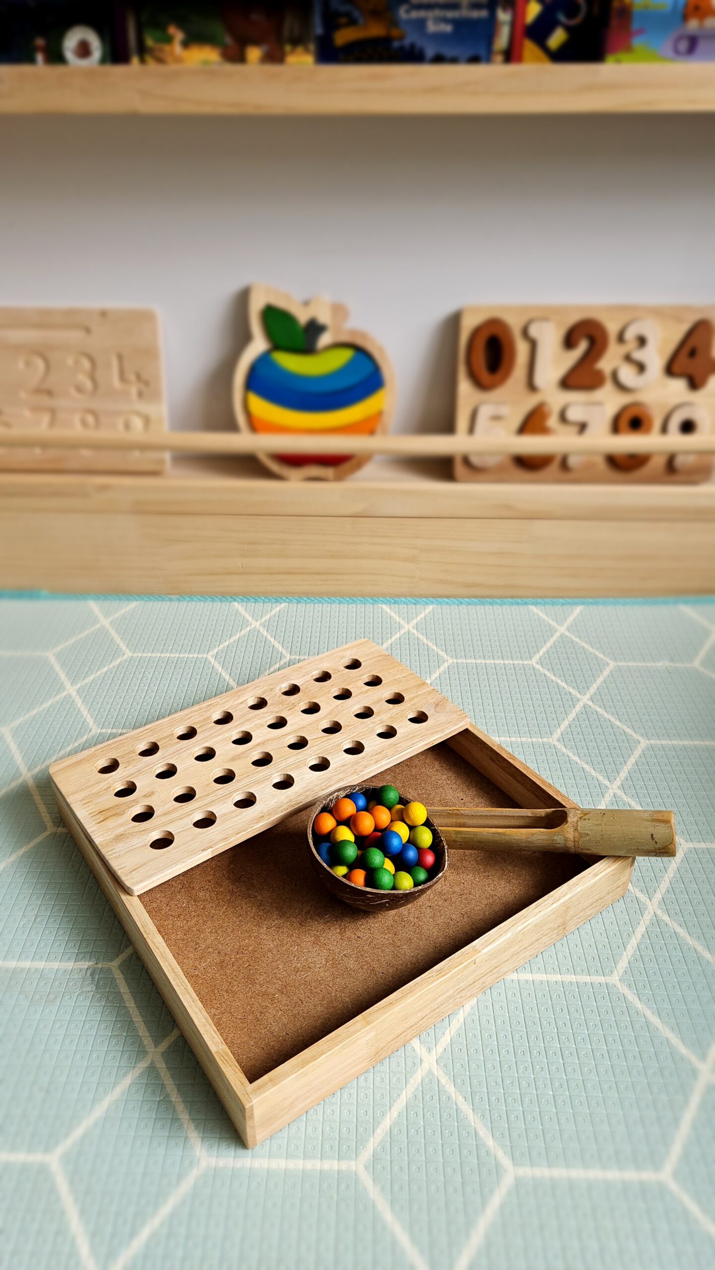 Furthermore, this tray insert also supports colour sorting activities, helping children to recognize and differentiate between different colours as they place the balls into the sections. This element of play not only enhances cognitive skills, but also introduces concepts such as categorization and organization, which are foundational for math and problem-solving later in life. This tray can also be used for lacing purposes.