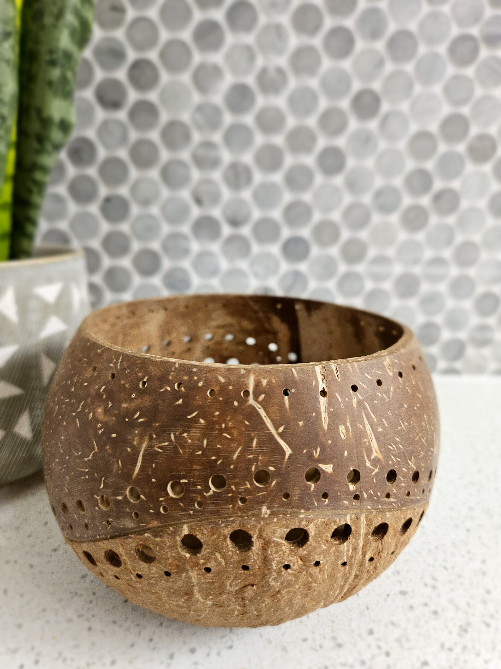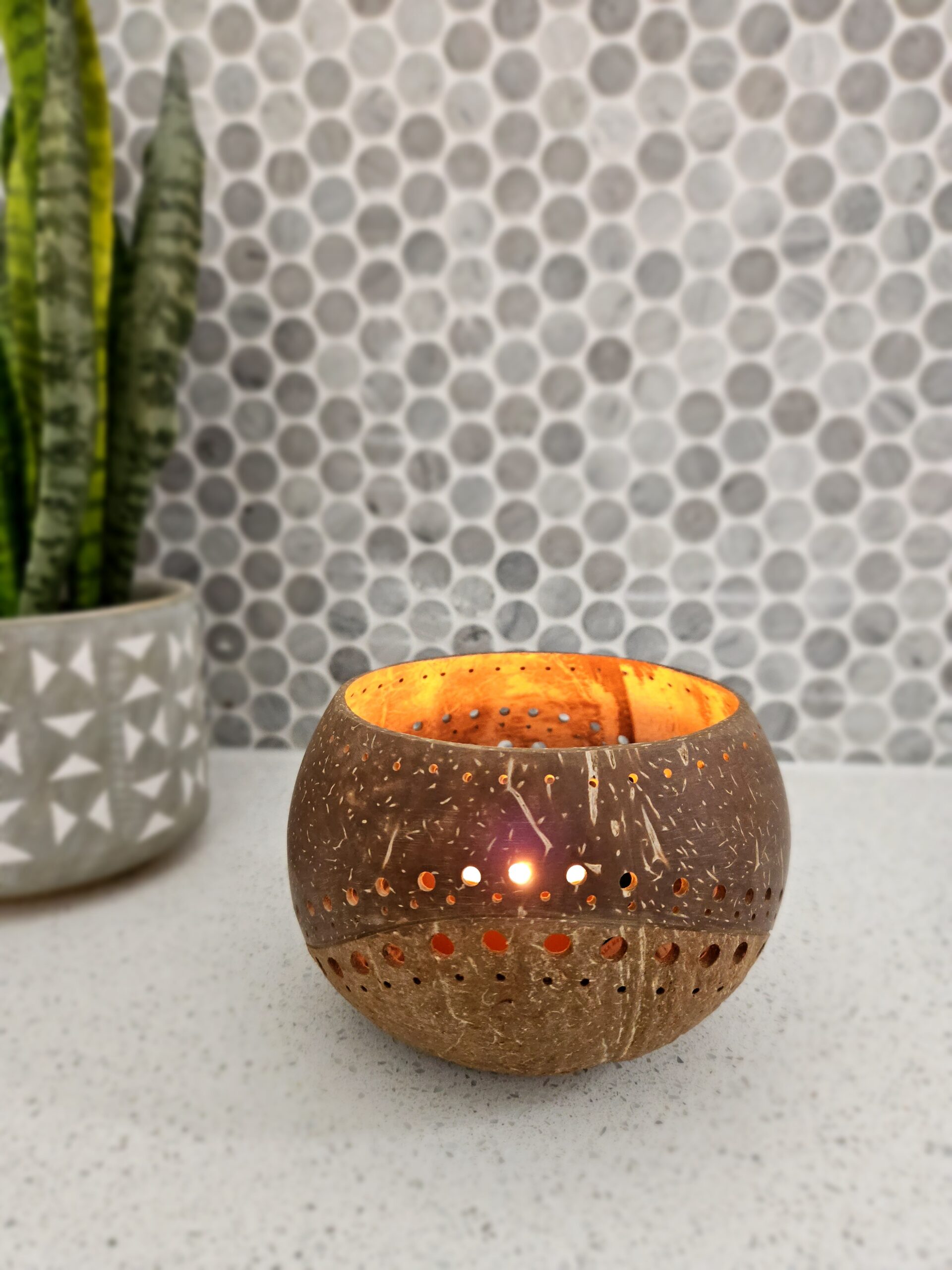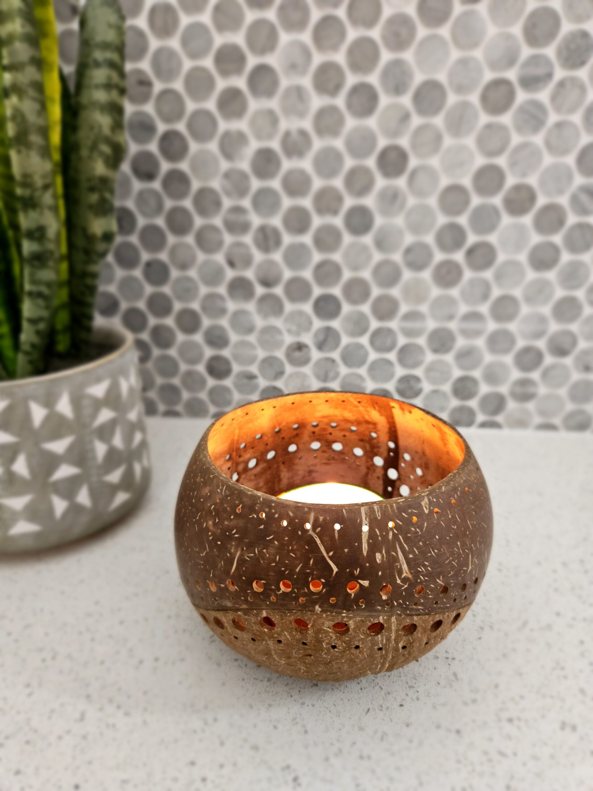 Simply place your favorite tealight or votive candle within the holder to cast a soft, inviting glow that illuminates the intricate details of the coconut shell.