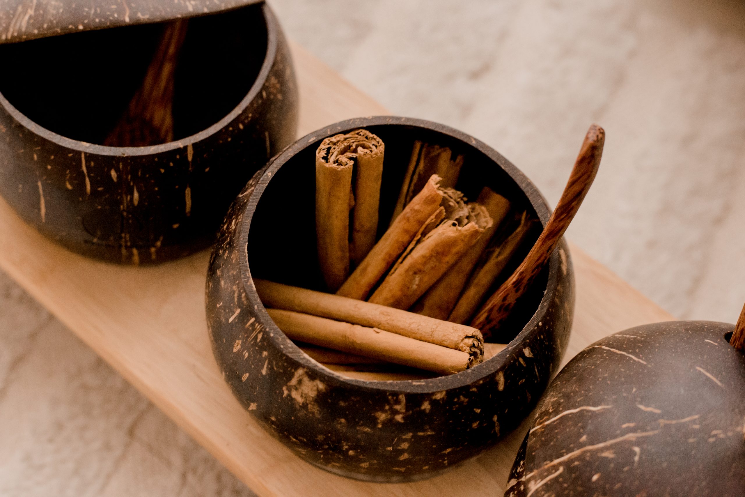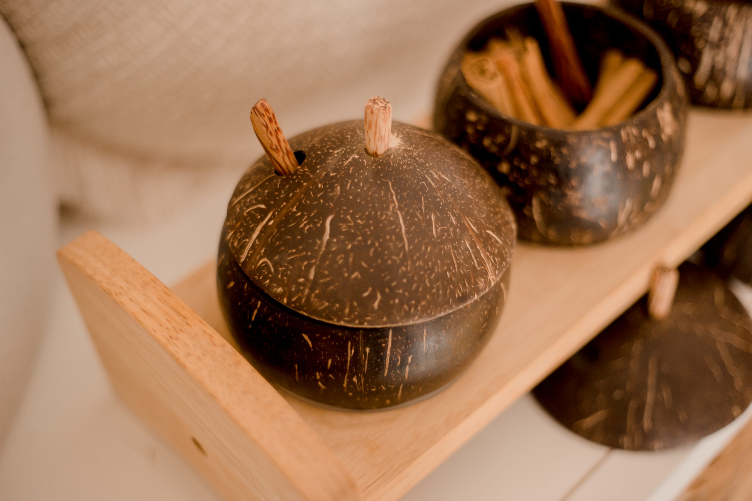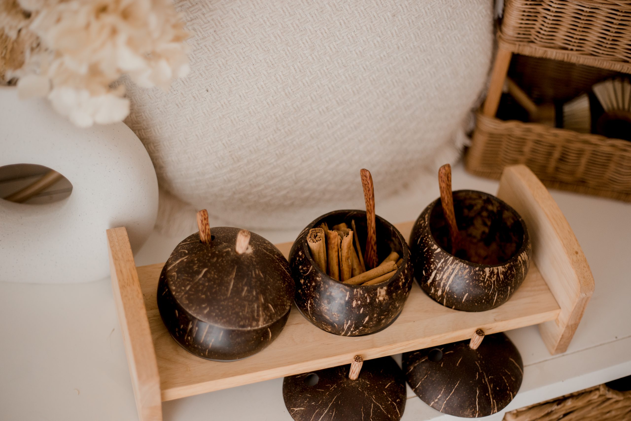 Coconut Spice Jar and Rack – A beautiful set of 3 coconut spice jars with spoons and a storage rack.