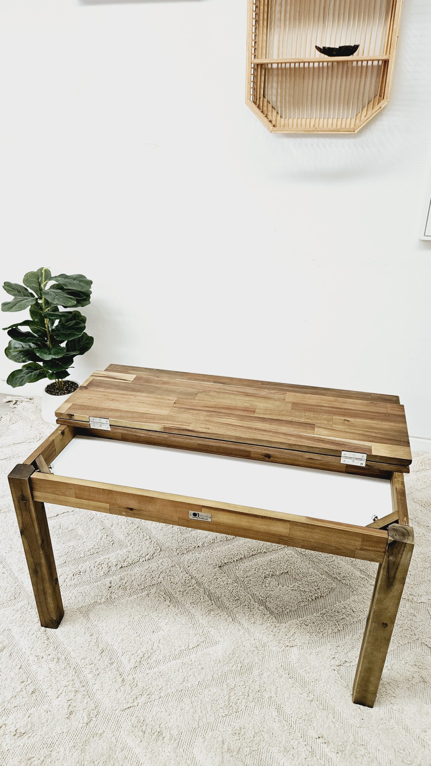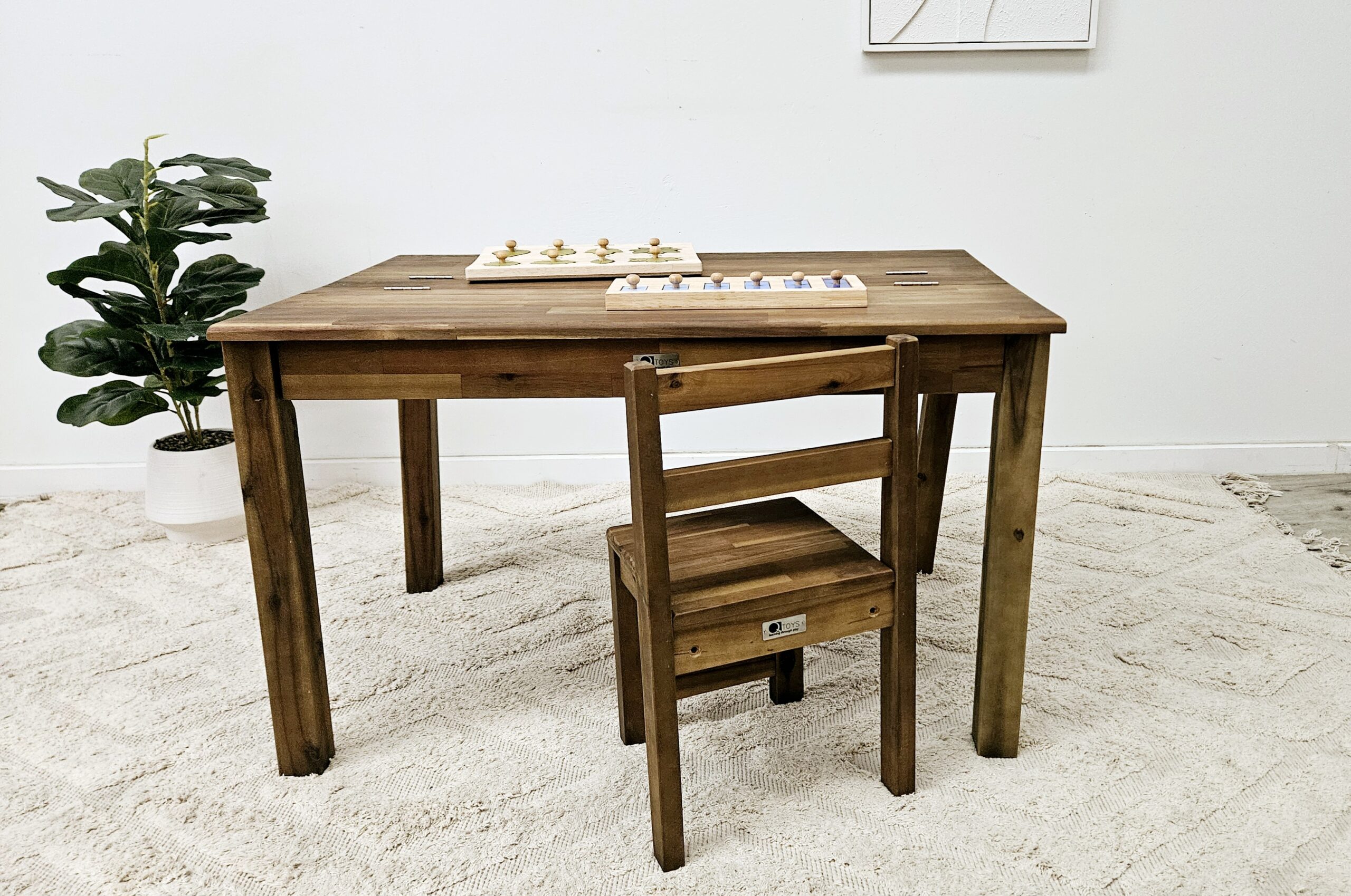 Made from high-quality plantation acacia hardwood, this table showcases exceptional durability and natural beauty. The wood undergoes an oiling and staining process that enhances its rich color and provides a smooth, elegant finish. This not only highlights the wood’s natural grain but also ensures longevity and resistance to wear and tear, making it ideal for environments with active children.