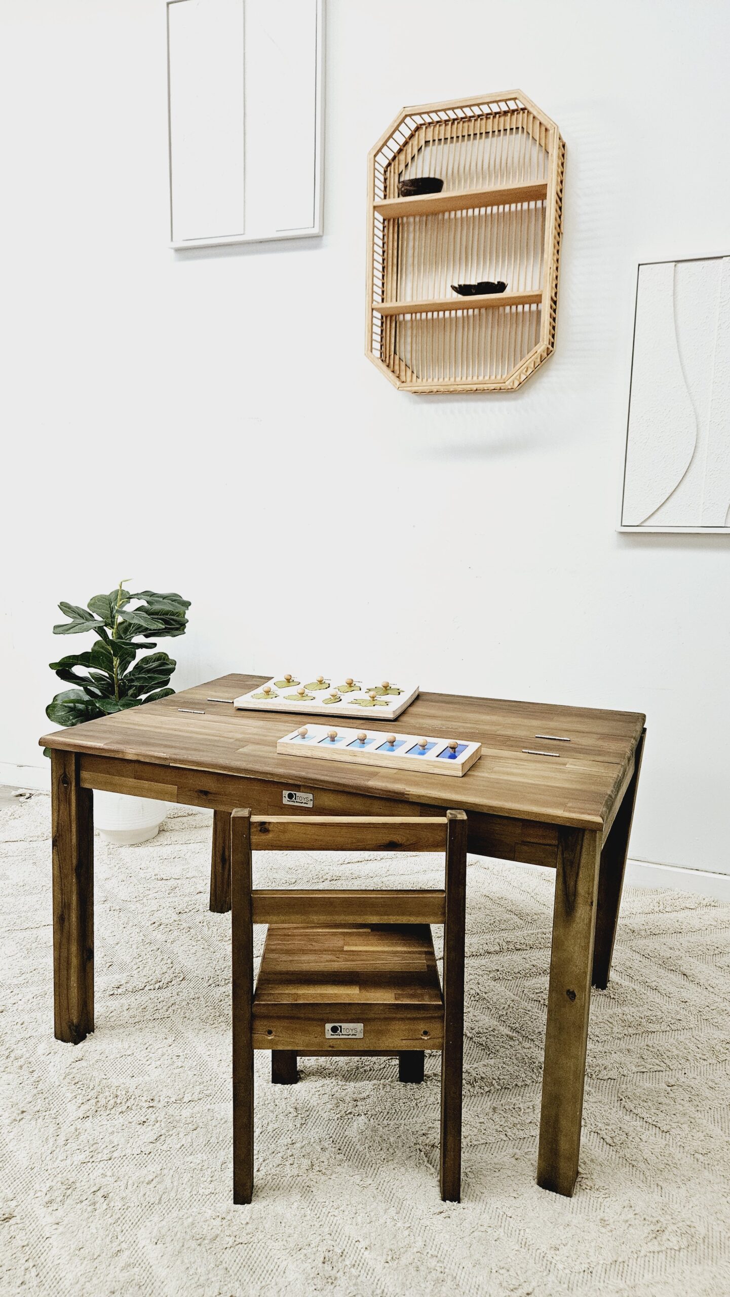 Accompanying the table, you will find two standard chairs designed for comfort and support, perfectly sized for young learners. These chairs, like the table, are crafted from the same durable acacia hardwood, ensuring a cohesive and stylish look.