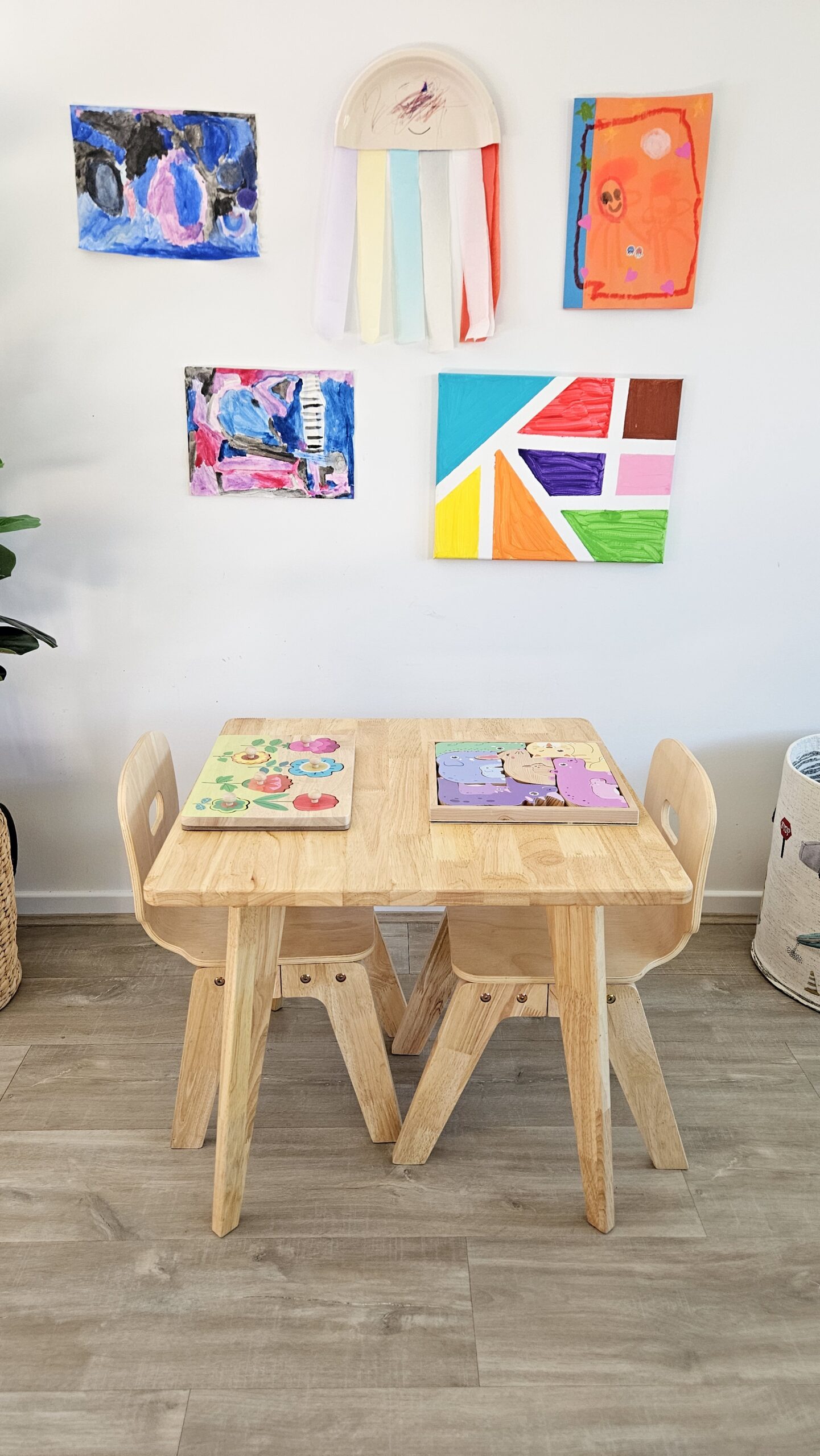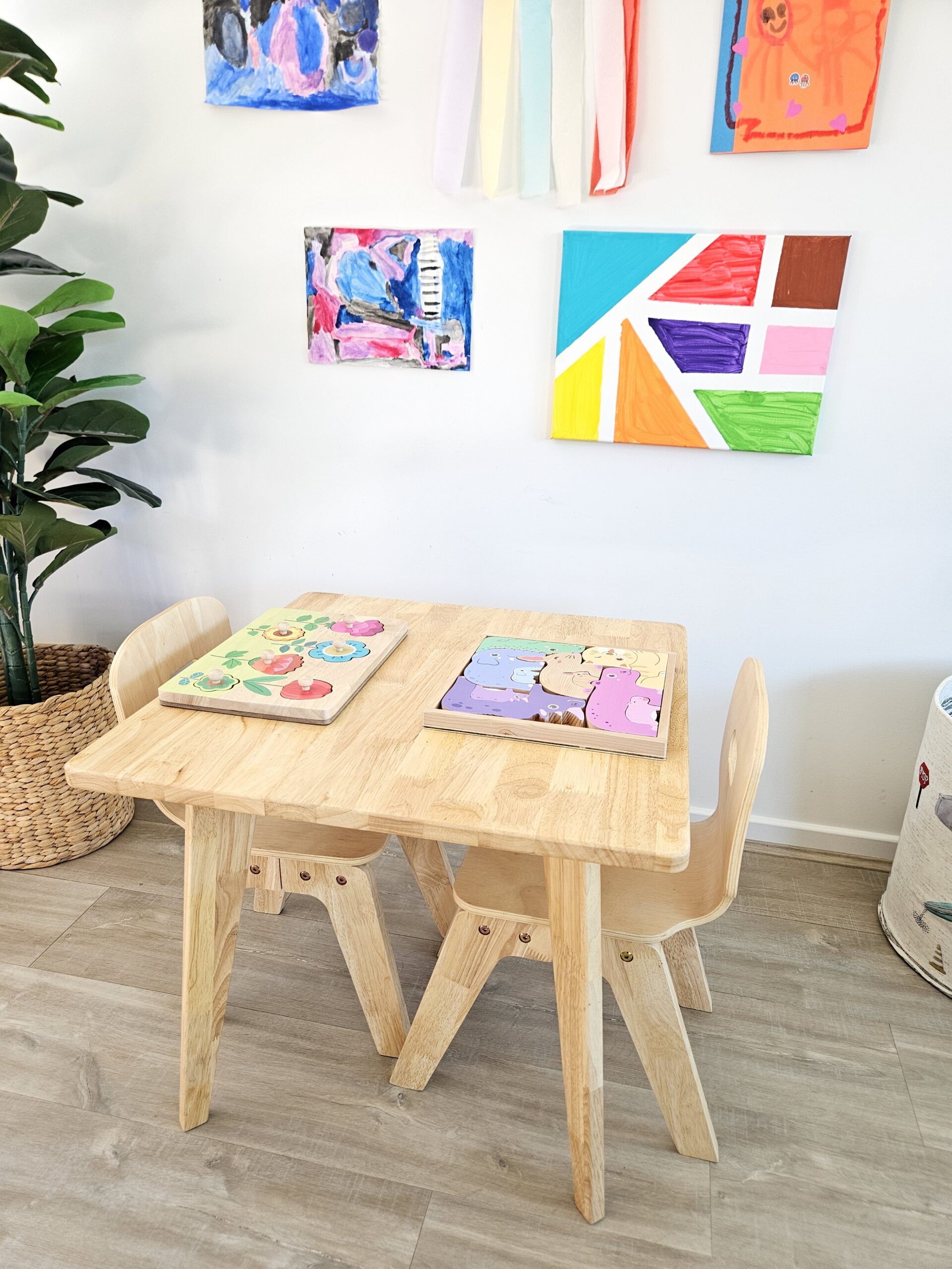 Introducing the Qtoys Danish Square Table and 2 Chairs Set – a perfect addition to any child’s playroom, classroom or learning space. Crafted from sustainably sourced wood, this beautifully designed furniture set combines timeless style with durability and child-friendly function.