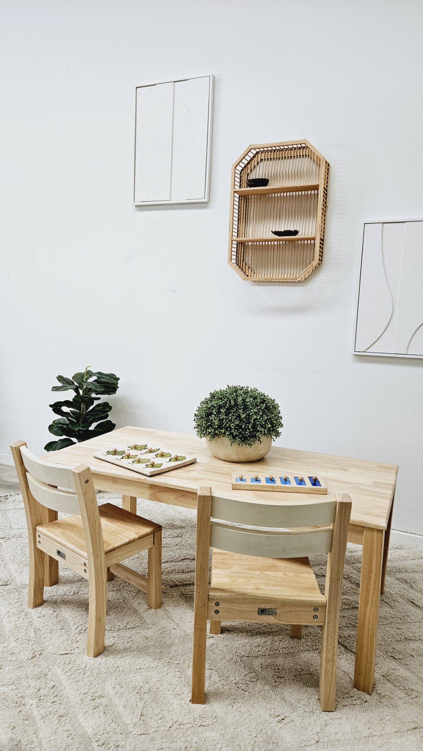 In conclusion, our  set offers the perfect blend of functionality, comfort, and safety for classrooms and family settings. With its spacious design and sustainable materials, it provides an inviting space for children to learn, play, and dine together. Invest in Solid Rectangular Table with 2 Stacking Chairs set today and create a welcoming environment where memories are made and cherished.