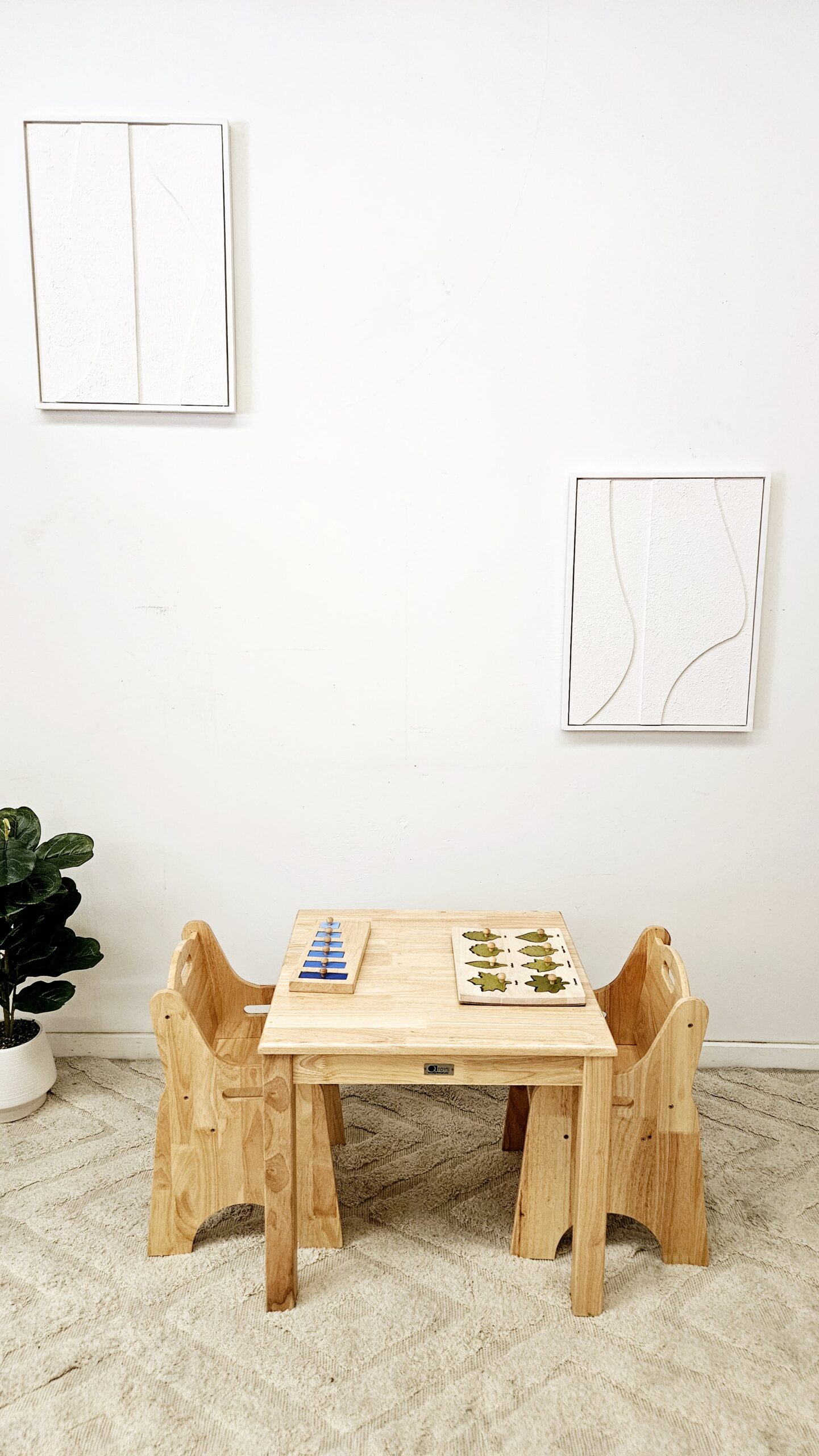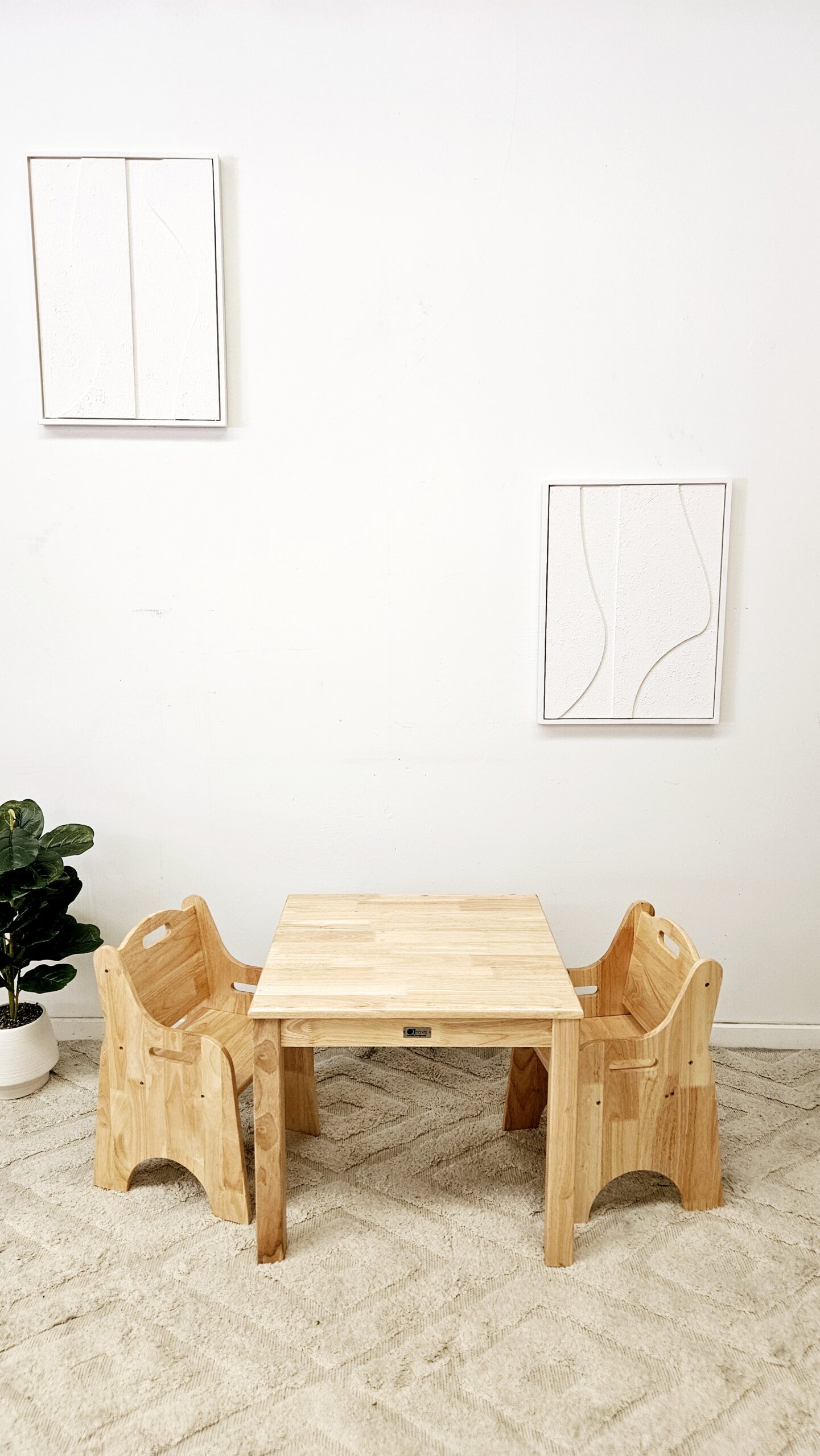 Introducing a set of Solid Timber Table with 2 Toddler Chairs, perfect for your little one’s playroom or learning space. This charming furniture set, crafted from oiled Rubberwood, combines elegance with functionality, creating an inviting and practical environment for young children. The natural finish highlights the wood’s rich, warm tones, adding a touch of sophistication to any room.