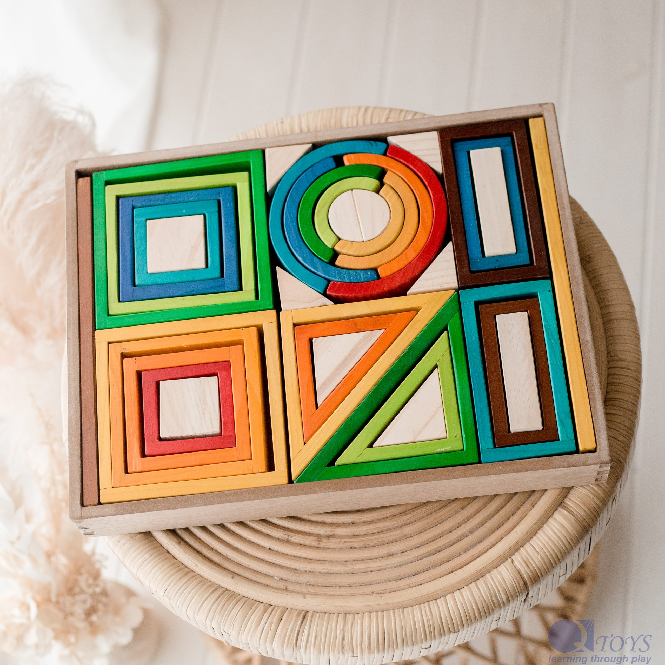 Our rainbow and nesting blocks are a perfect, well-rounded all-in-one building set designed specifically for children. This set is carefully crafted to provide endless opportunities for exploration, creativity, and skill development. This set includes a wide range of hollow blocks in various shapes and beautiful, vibrant colors. This diversity allows children to engage in imaginative play, learn about shapes, and explore color concepts.