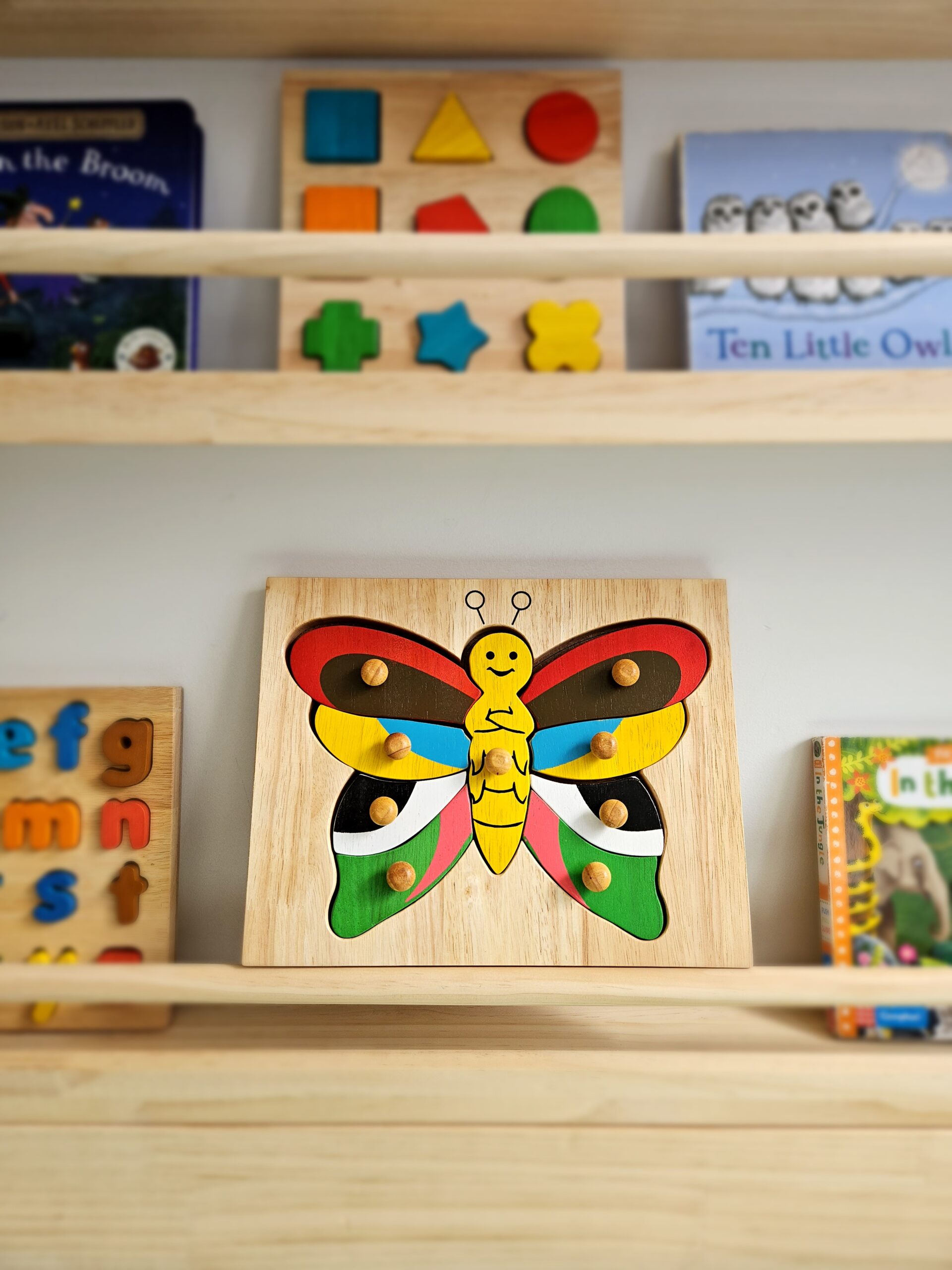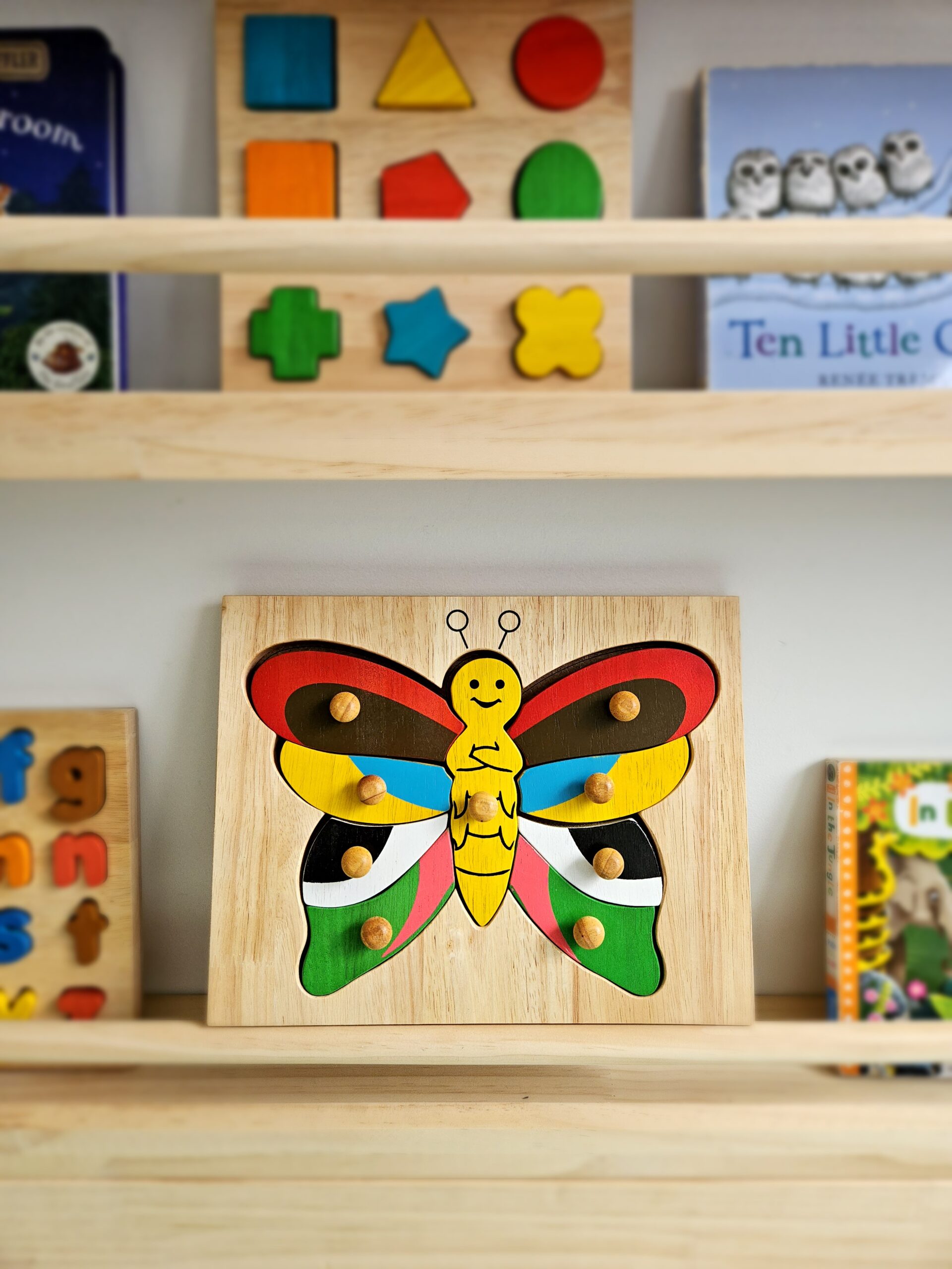 Introducing our butterfly knob puzzle. It consists of 9 pieces with a little knob perfect for little ones to grasp. Children can be encouraged to fix the pieces of puzzle which promotes their fine motor skills. They can also be encouraged to identify colours which promotes colour recognition.