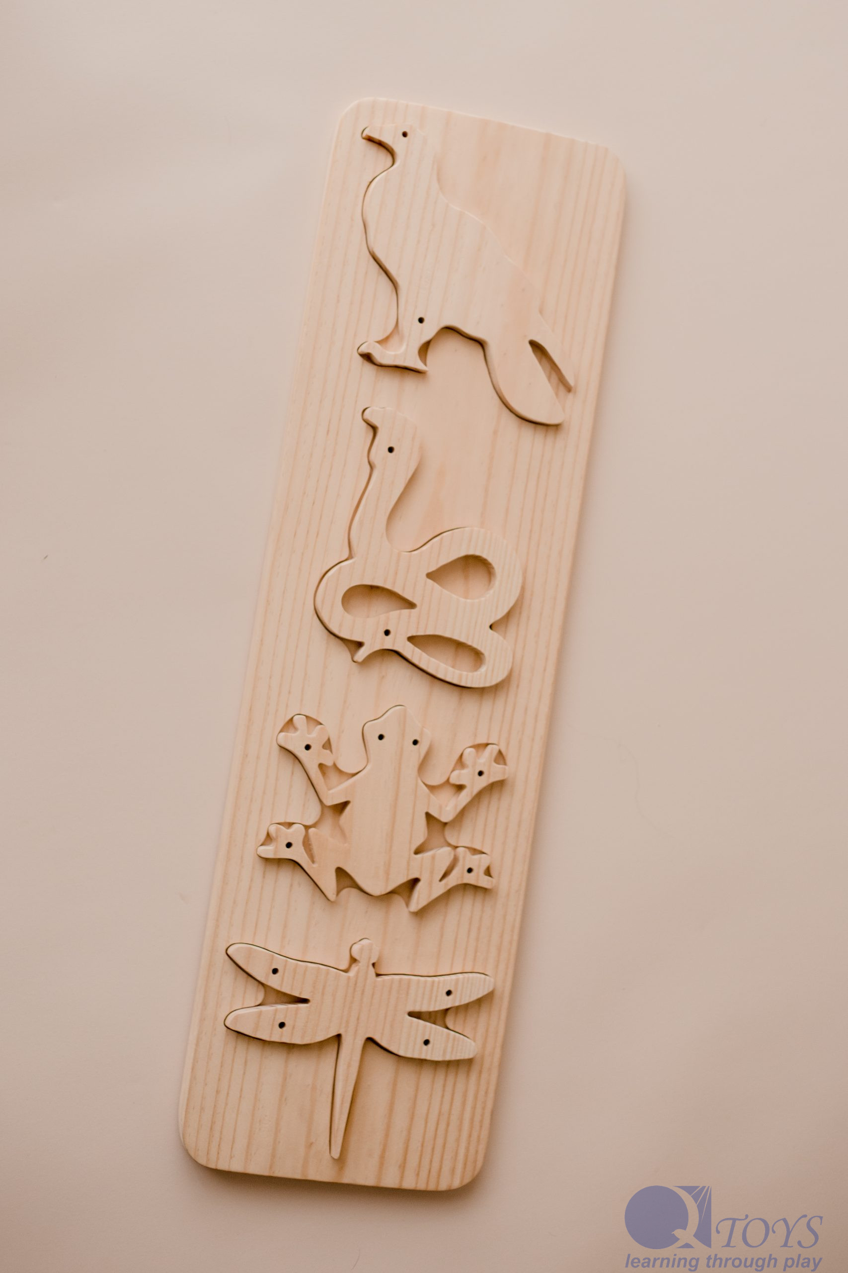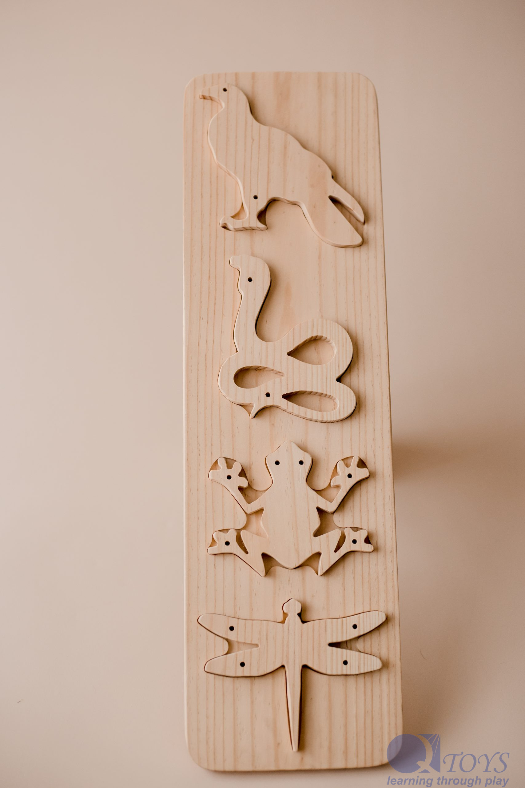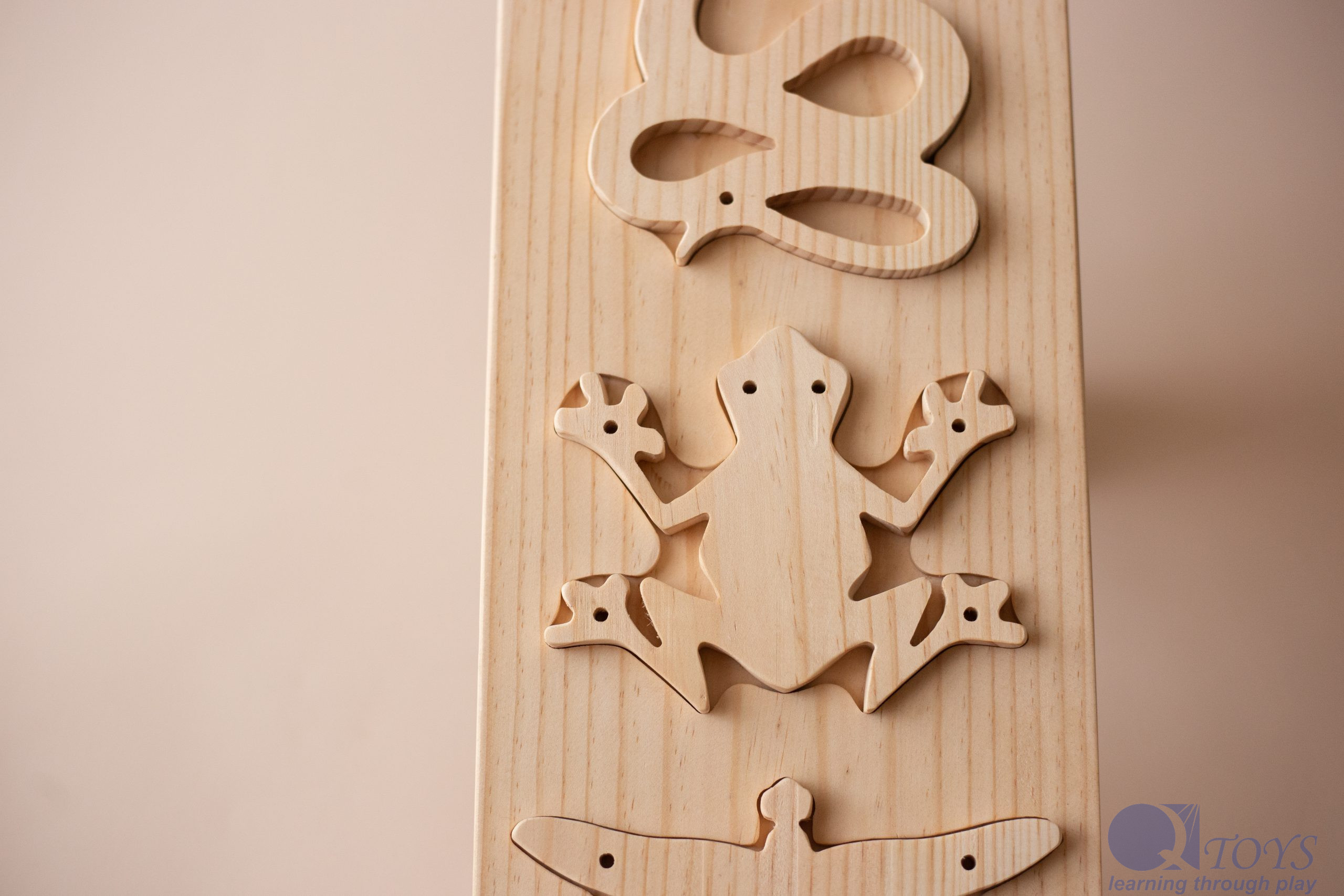 This Food Chain Lacing Set, thoughtfully crafted, comprises a quartet of wooden pieces representing key players in the chain: an insect, a frog, a snake, and a bird, accompanied by a string. Through tactile engagement, children are empowered to assemble these pieces, mimicking the progression of energy transfer in ecosystems. The term “food chain” encapsulates the intricate web of dependencies among various organisms as they rely on each other for sustenance.