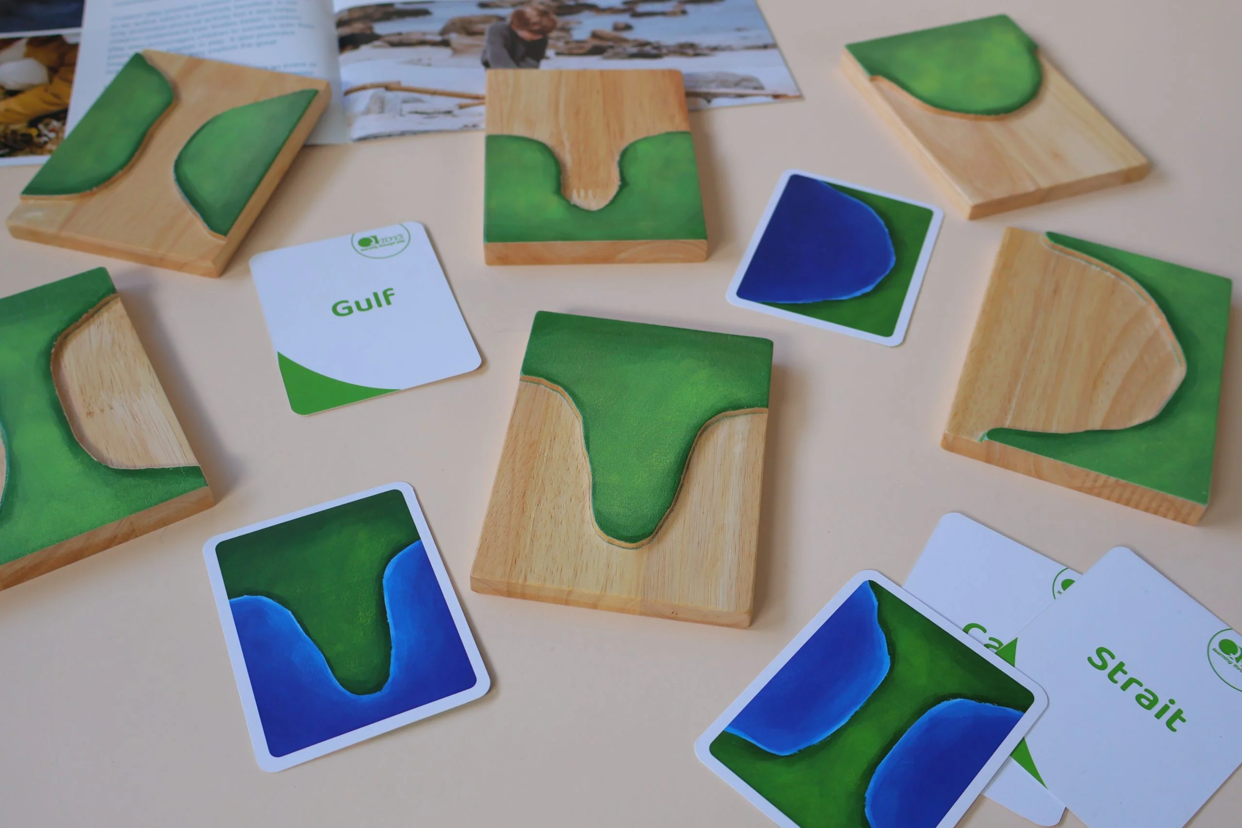 Each set includes six wooden tiles representing key land and water forms – bay, cape, gulf, strait, peninsula and isthmus – along with matching labeled cards. The contrasting green “land” and natural wood “water” areas visually demonstrate how these features appear in nature, making abstract concepts easier for children to grasp.