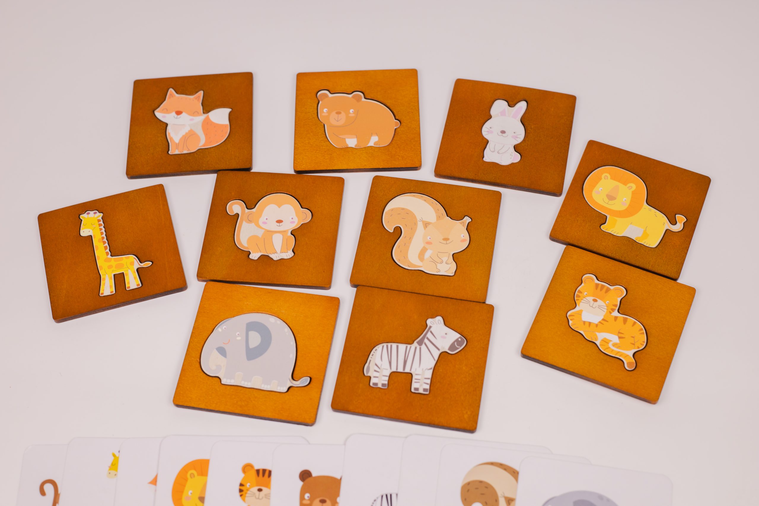 Picture Pairing: Lay out the flashcards and ask your child to place the matching wooden animal on top of the card.