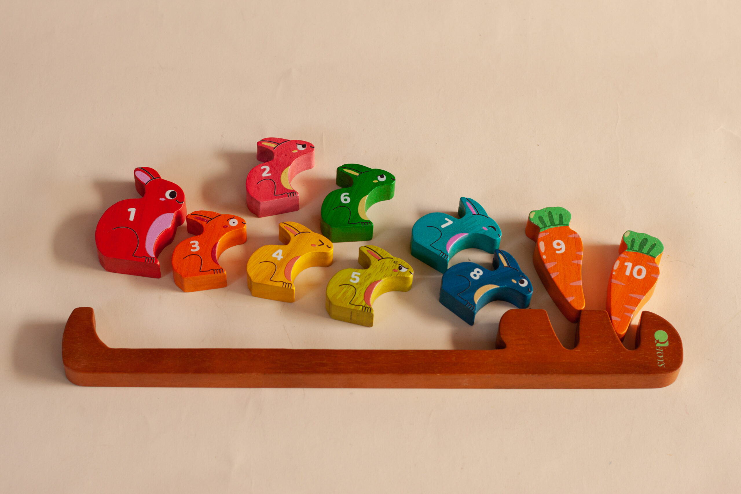 To start, children are introduced to numbers 1 through 10 with ten beautifully painted wooden rabbits in a rainbow of colours with the carrots. Each rabbit is numbered and fits perfectly into the wooden base. This helps children visually and physically connect numbers. As a result, little learners quickly begin to grasp the concept of counting and numerical progression in a hands-on way.