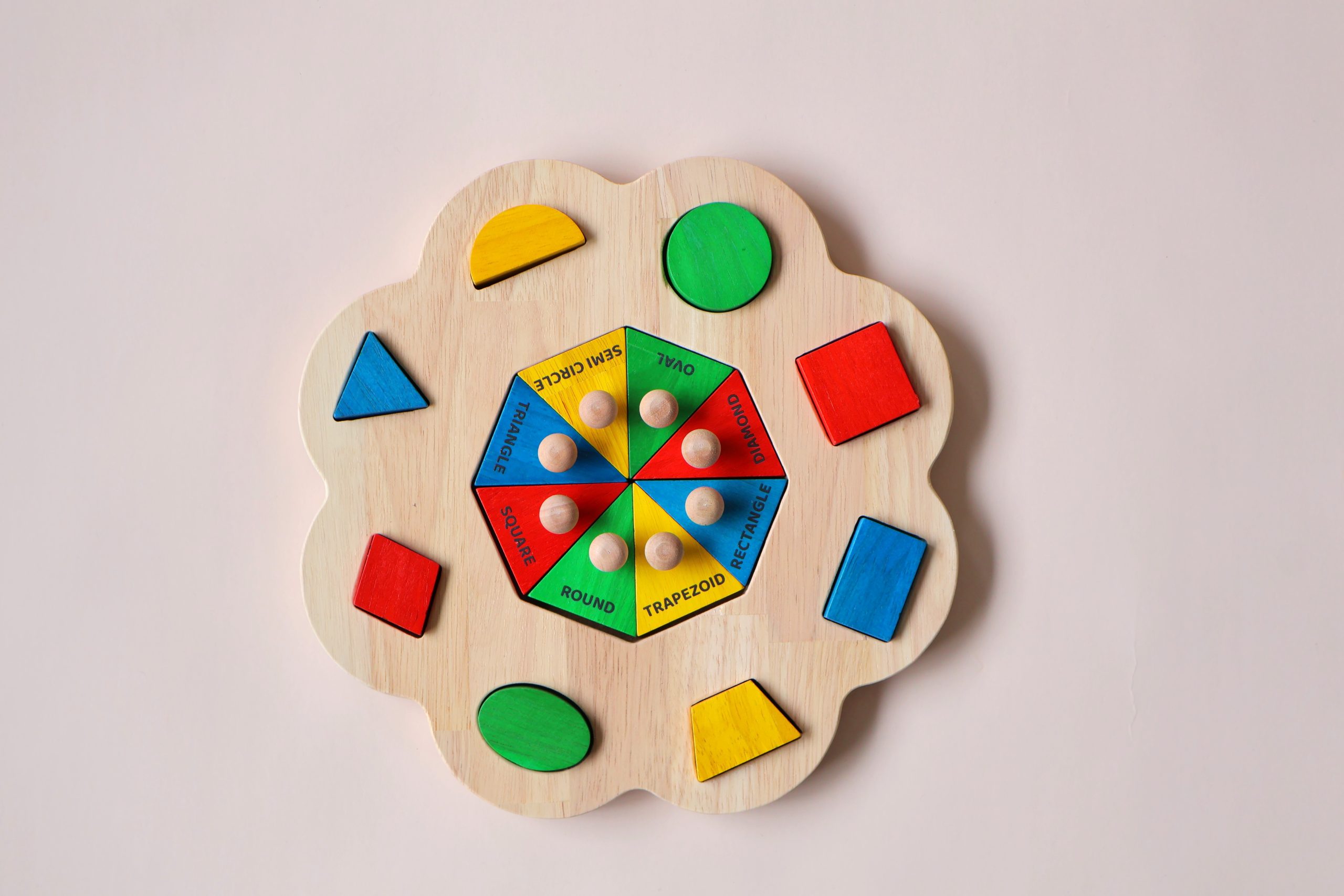 Playing with a shape puzzle that features names and colors offers numerous cognitive benefits for children. As they manipulate the puzzle pieces, they enhance their understanding of shapes and colors while refining their hand-eye coordination. This hands-on approach to learning fosters cognitive growth and spatial awareness in an enjoyable and engaging way.