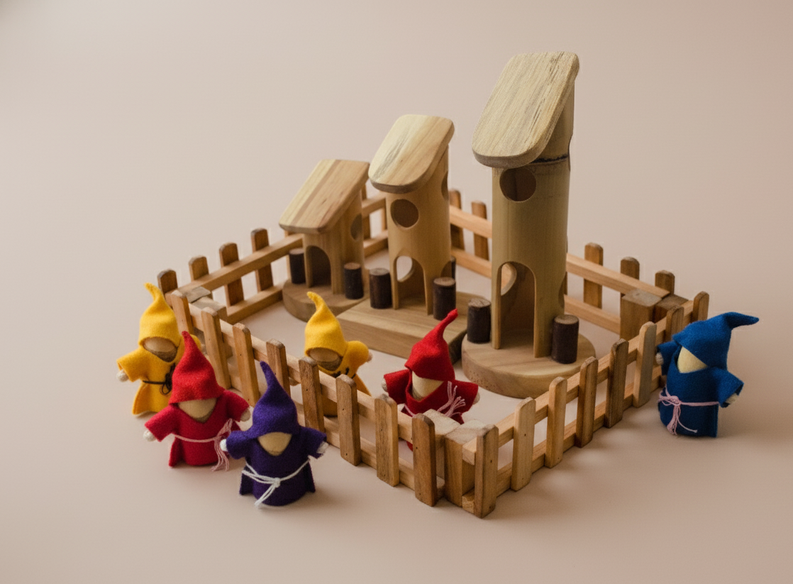 Bringing Stories to Life: However, a village isn’t complete without its inhabitants! Therefore, the five Wooden Gnomes, each distinctly dressed in vibrant colours, are ready to embark on fantastical quests or simple daily routines. As a result, children instantly deepen their imaginative scenarios, exploring the dynamics of a bustling community.