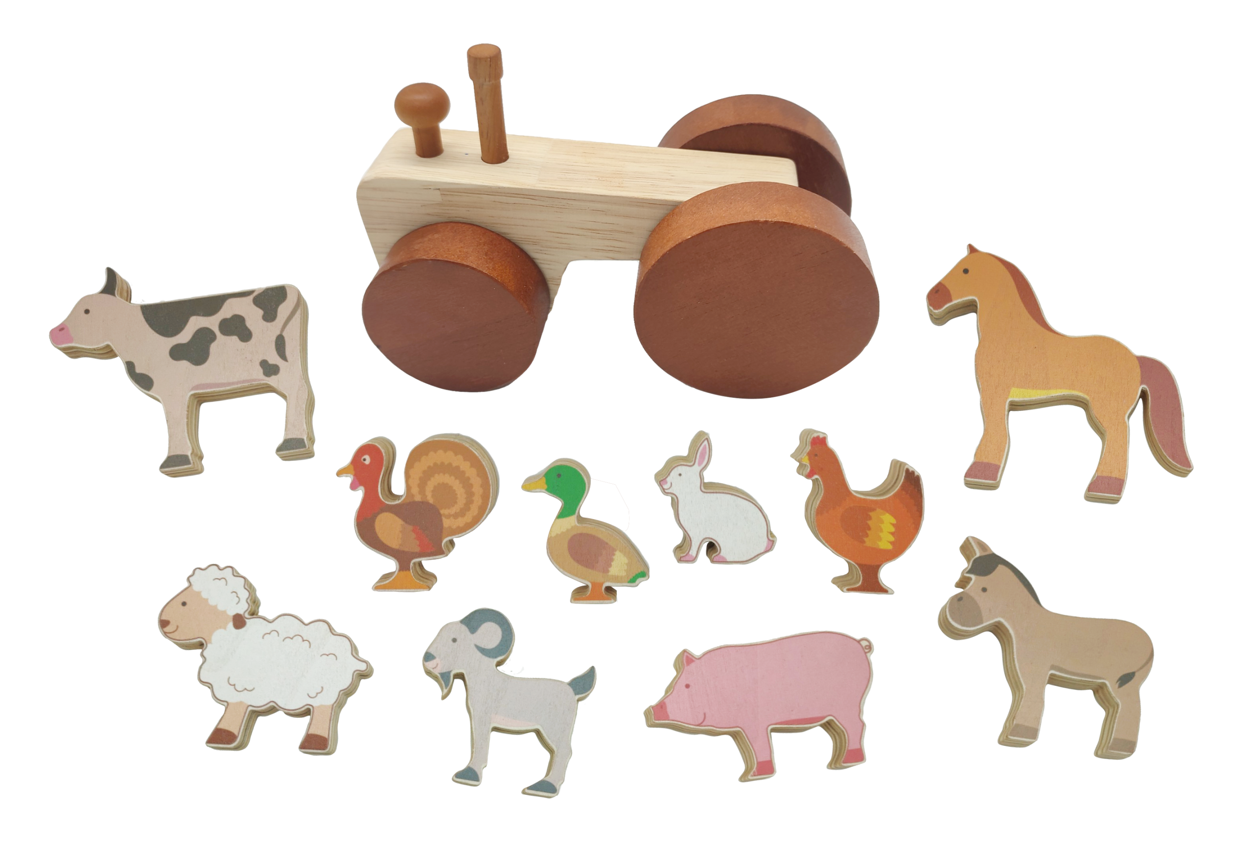 Introducing the Farm: Our beloved animal collection boasts a charming array of farm favourites—cow, pig, sheep, horse, chicken, and more, complete with a fantastic Tractor. These chunky, durable wooden pieces ignite imaginations, inviting children to re-enact events and craft compelling stories.