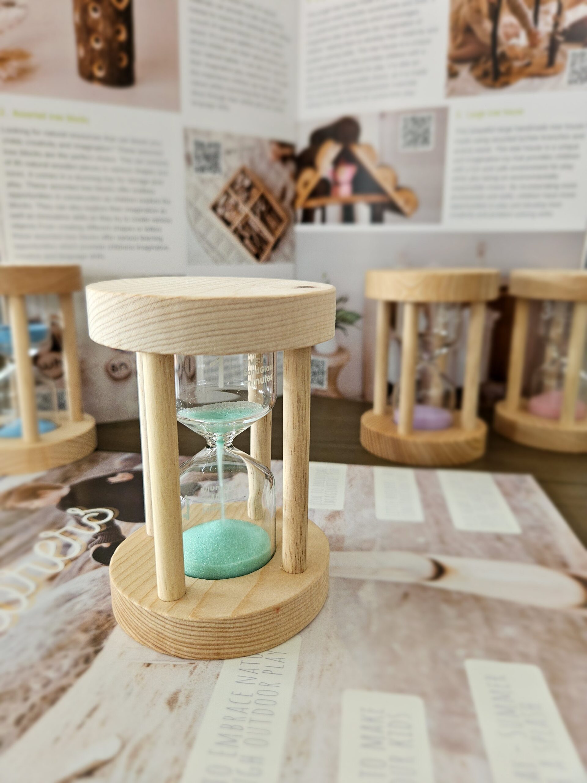 Each sand timer is uniquely designed to engage children in a fun and interactive way while promoting a sense of time management and patience. Children can observe the passage of time through the smooth flow of sand. This helps them grasp the concept of timing and fostering focus. Moreover, the natural wood finish seamlessly integrates into educational environments, homes, or offices, adding a touch of nature-inspired beauty.