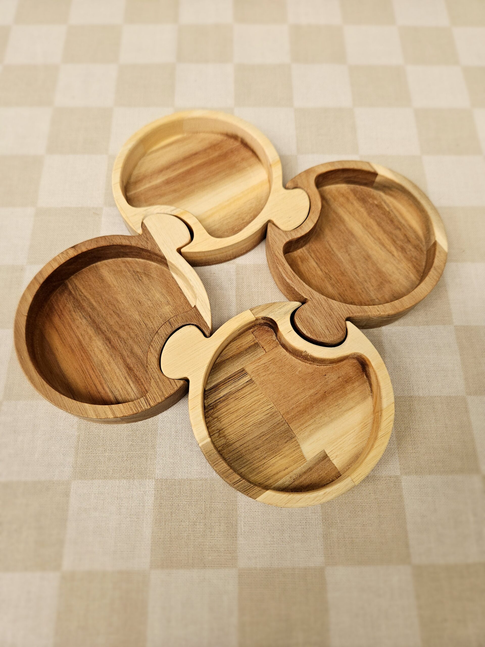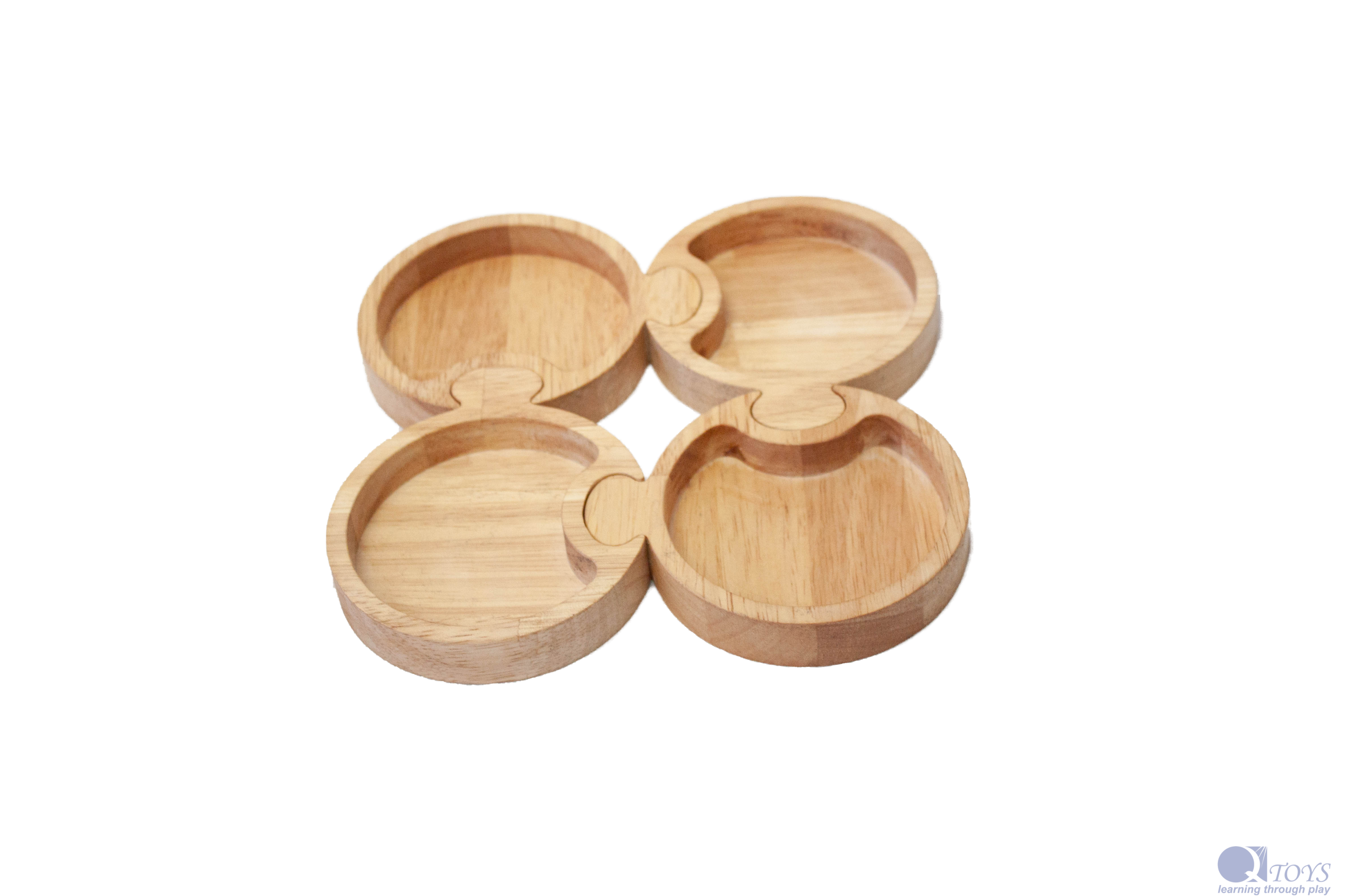 Beautiful 4 connected round trays. The tray can be detached and used separately or connected as a puzzle. This tray is great for sorting and sensory play or can be used for feeding. The trays are made of Acacia wood finished with beeswax.