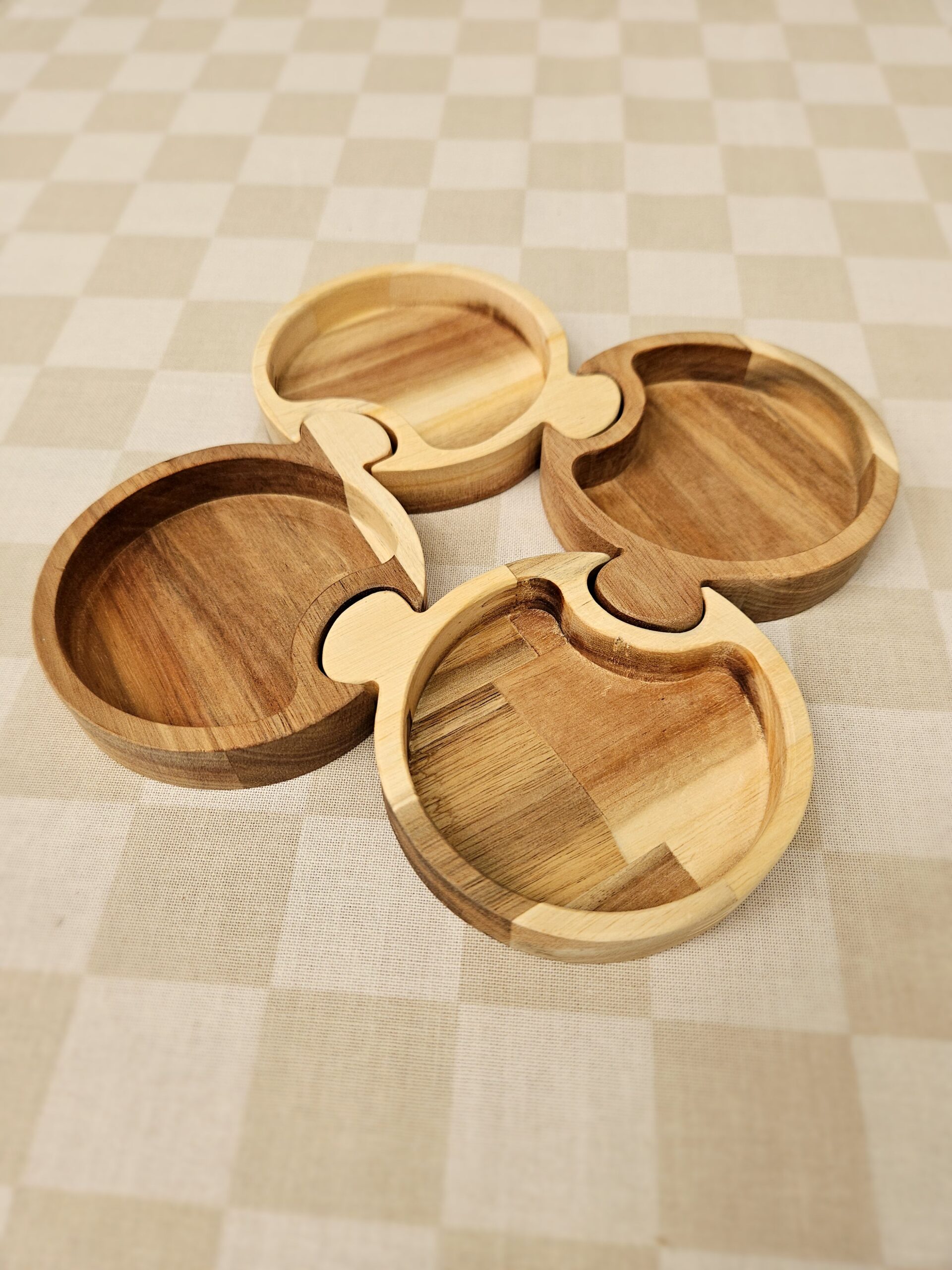 Introducing our beautiful set of four Round Puzzle trays, a versatile addition to your home. Crafted from high-quality Acacia wood and finished with a natural beeswax coating, these trays are as durable as they are elegant. Each tray can be easily detached and used separately, providing flexibility for various uses. When connected, they form a seamless, puzzle-like arrangement that adds a touch of sophistication to any setting.