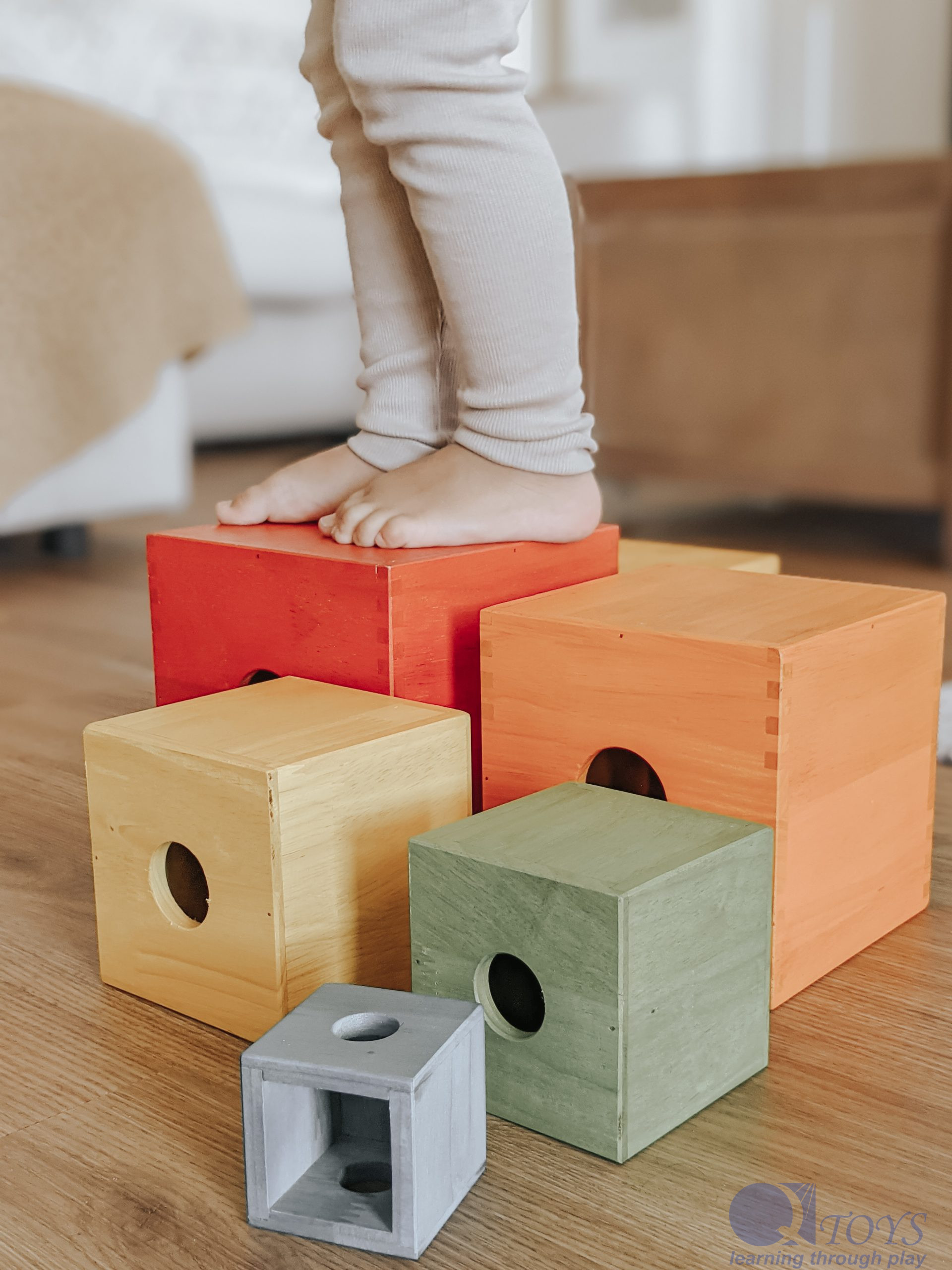 Our set of 8 rainbow nesting and stacking boxes are multi functional. This is a very exciting set as you can not only use them as boxes  for sorting experiences, but they can also be stacked in two different ways. They can be stacked one on top of the other to build a tower or they can be nested one inside the other.
