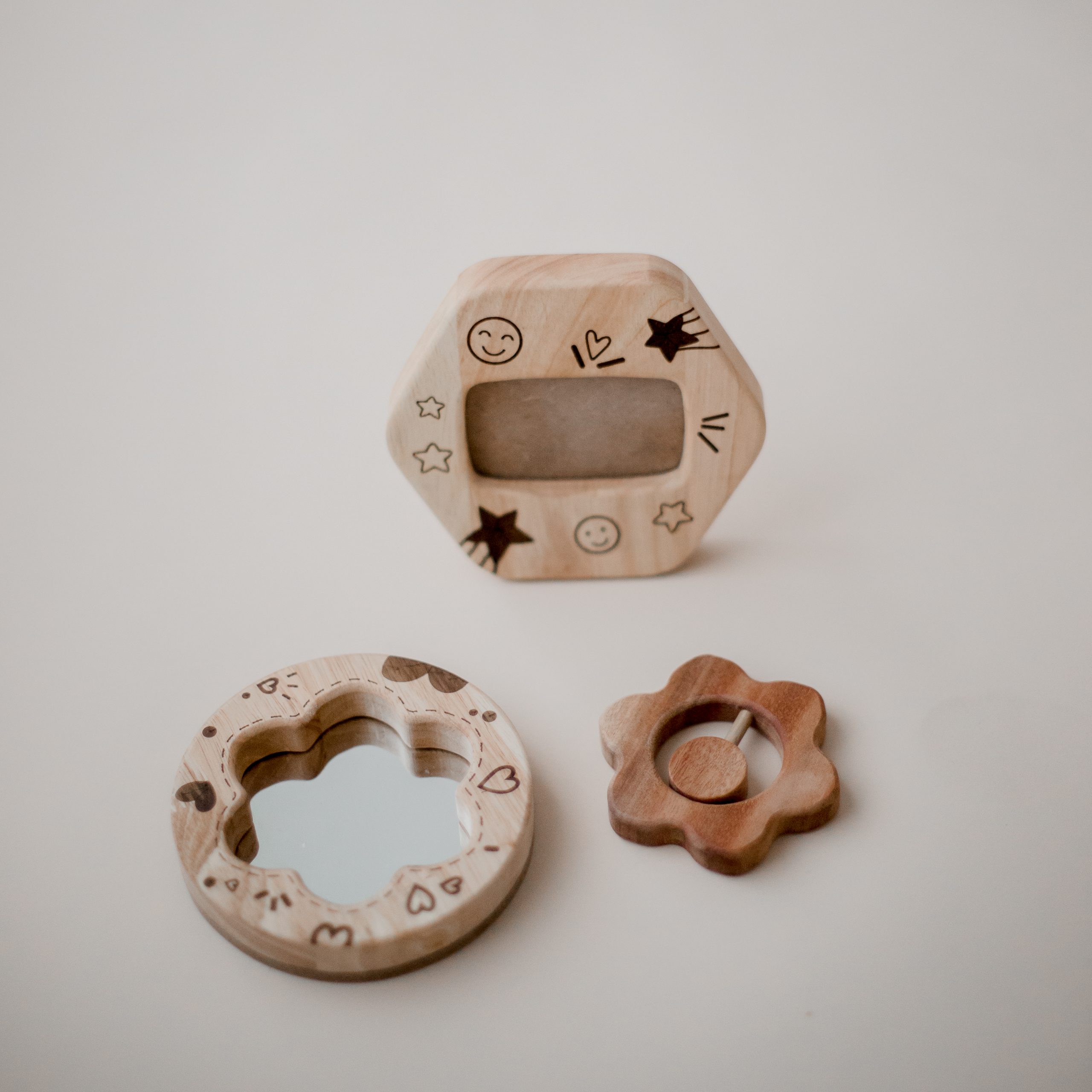 Introducing our baby shower gift set! This new set includes a wooden toy rattle, a mirror, and a photo frame, all designed to provide your little one with endless hours of fun and stimulation. Our wooden toy rattle is the perfect toy for babies and toddlers. It is made from high-quality, natural wood and features a gentle rattling sound that is sure to delight your little one.