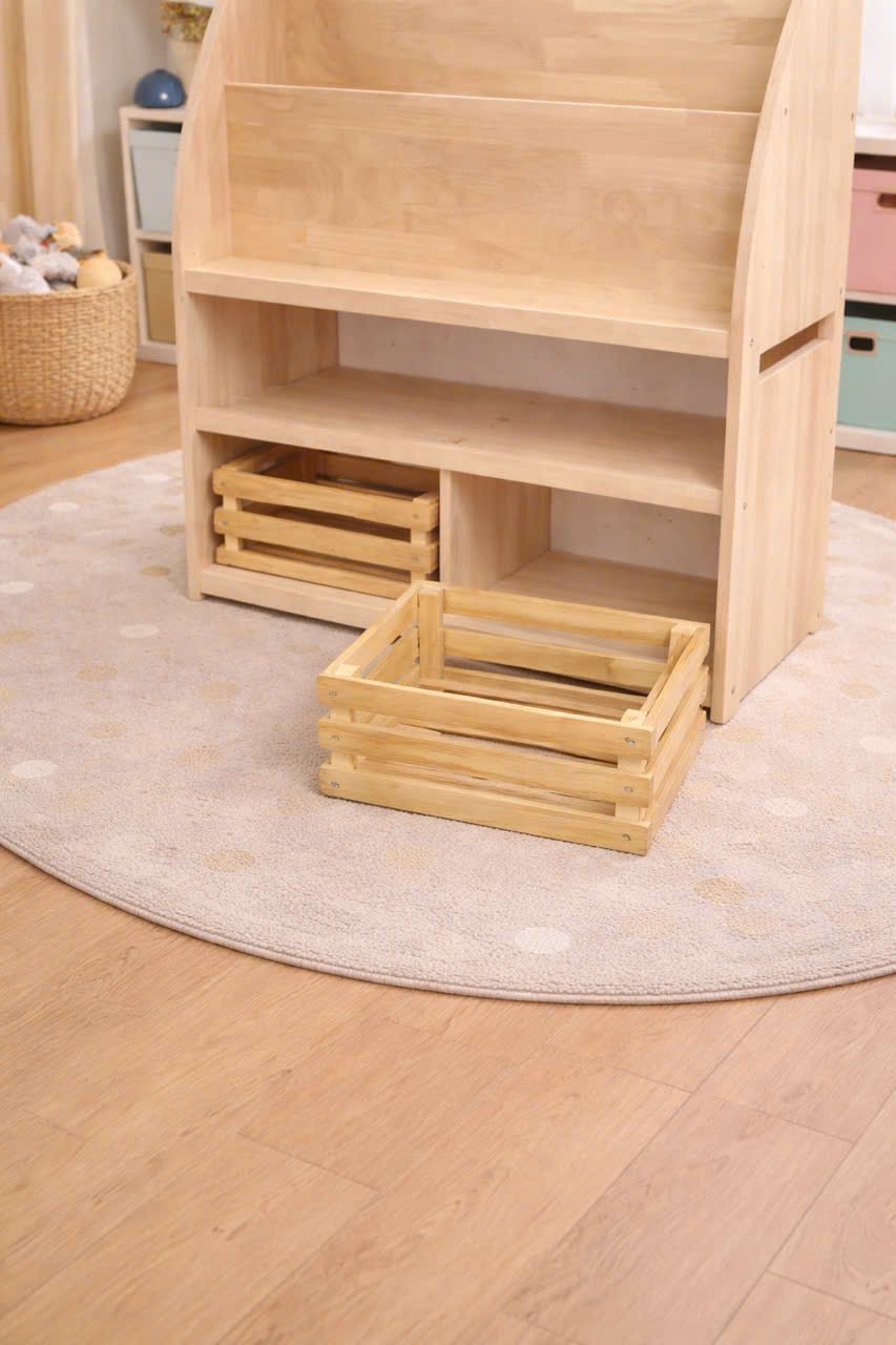 Traditional shelves often lead to “book avalanches” when a child tries to pull one out. The tiered design of the Bookshelf with bamboo storage crates keeps books upright and organized. By displaying a curated selection of 5–10 books, you help your child focus on quality rather than being overwhelmed by quantity.