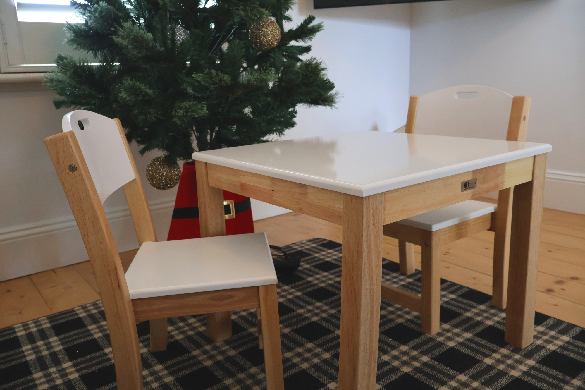 A beautiful hard wood table. This item is made of Acacia hardwood and painted white. Table comes flat packed and is easy to assemble. All Qtoys products are made using plantation timber, using child safe materials.