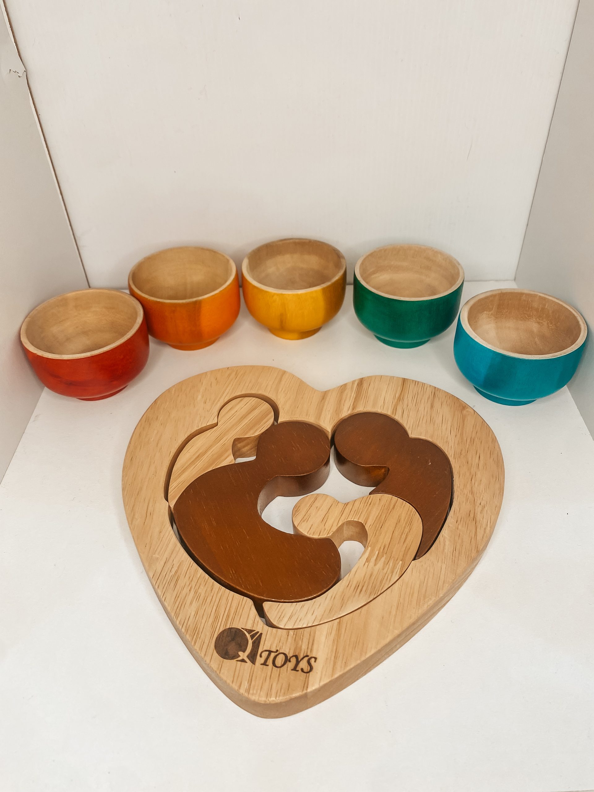 Materials:Crafted from Plantation Rubberwood, Acacia or Canadian Hemlock. Some of our toys are also made from industrial byproducts of coconuts and lychee trees. We ensure zero waste and minimal environmental impact. Finish:Dyed with non-toxic, water-based color stains. The texture of the natural wood remains palpable, connecting the child to nature and enhancing sensory development (Steiner philosophy). |