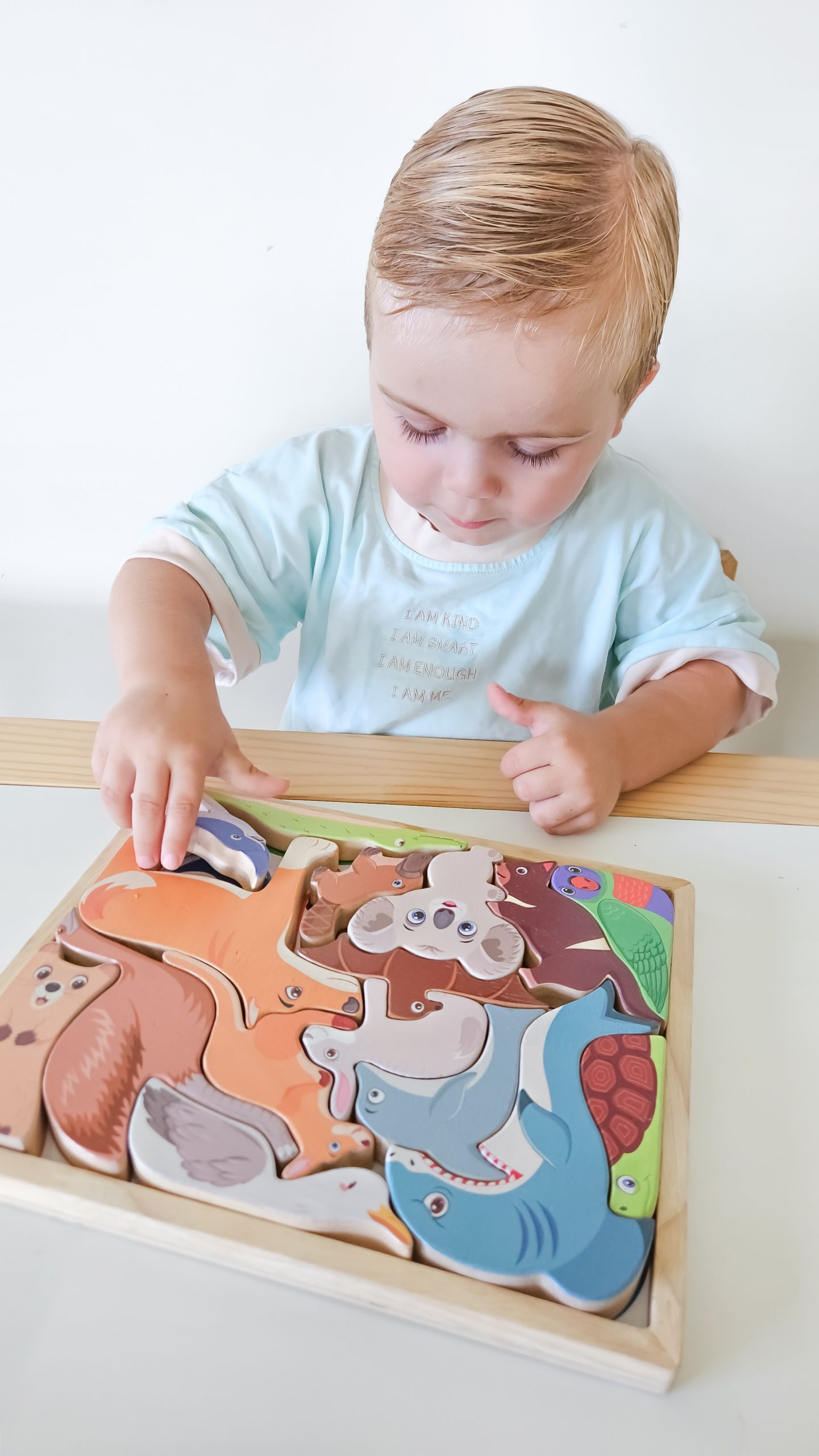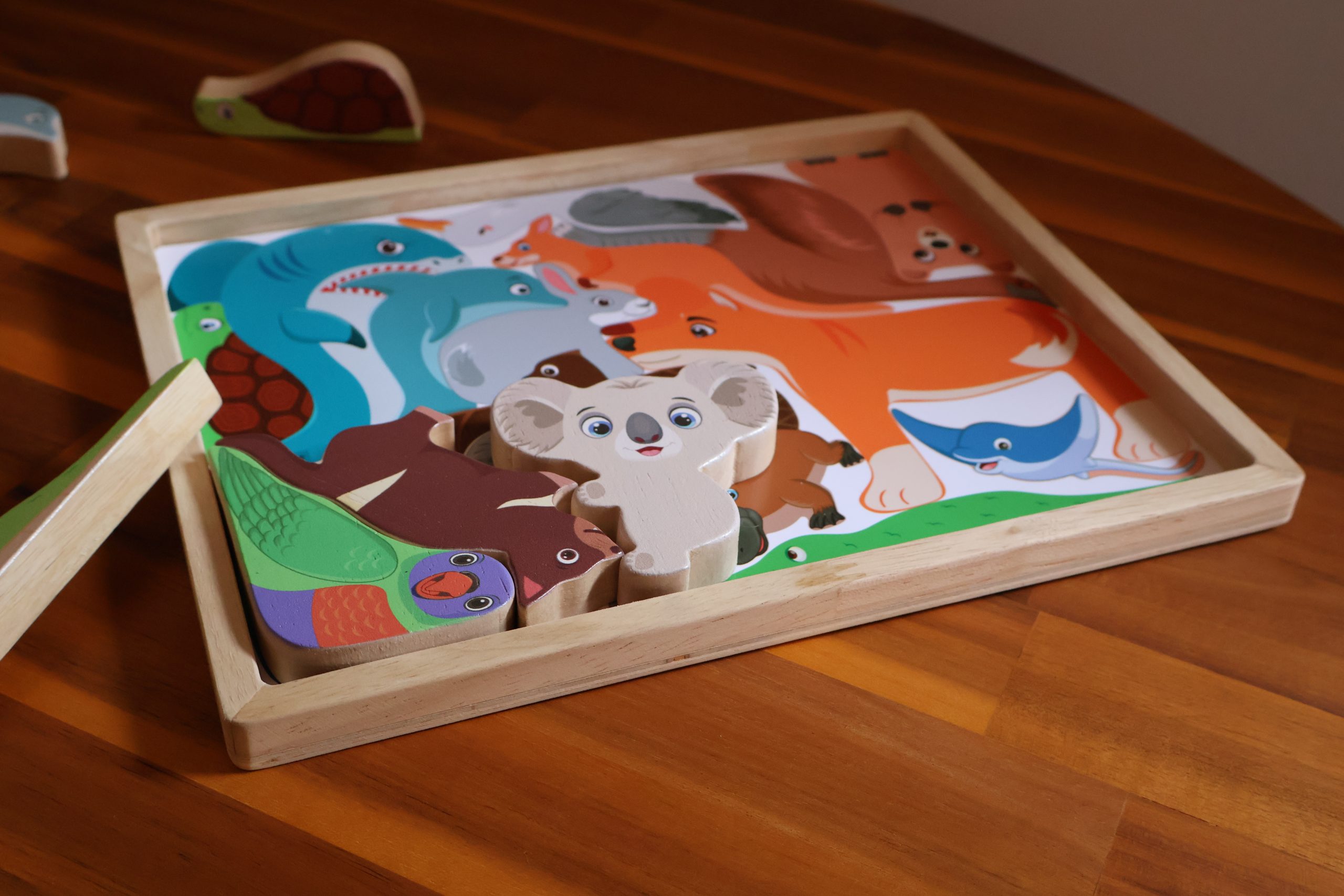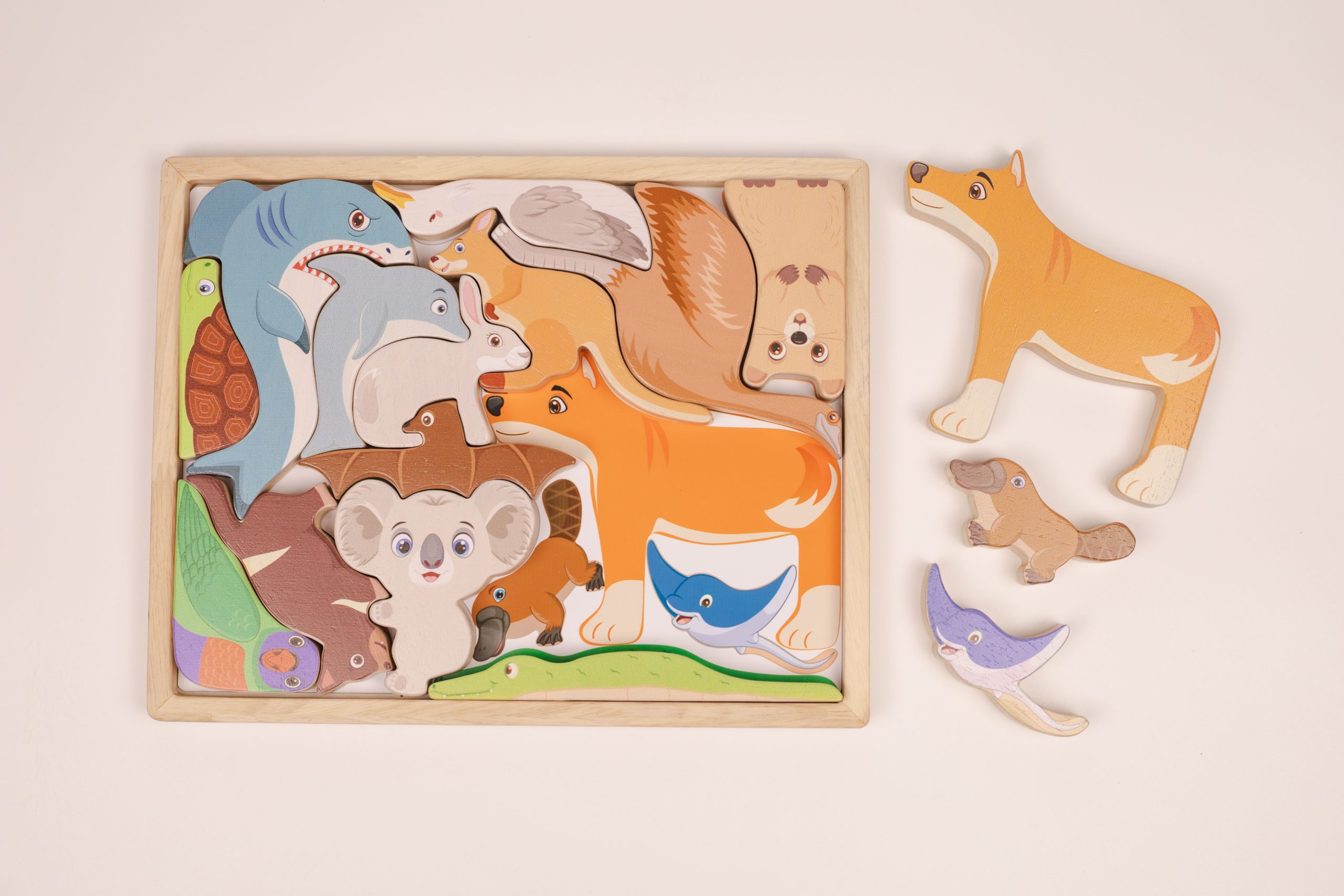 Explore the Outback and the Ocean from your playroom! This vibrant wooden puzzle features 13 iconic Australian animals—from the playful Dolphin to the cuddly Koala—designed to fit together in a unique, interlocking challenge that builds spatial reasoning and fine motor skills.
