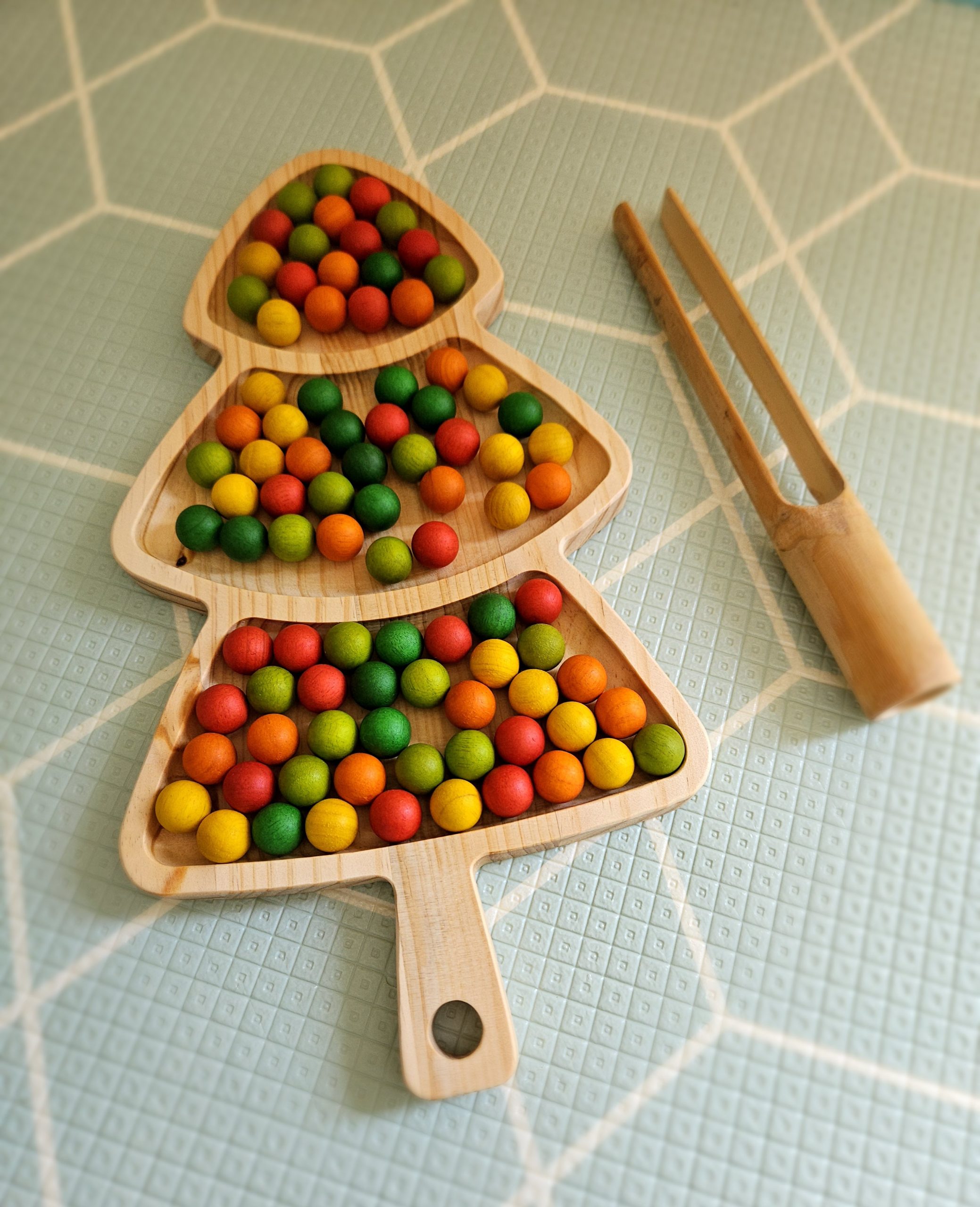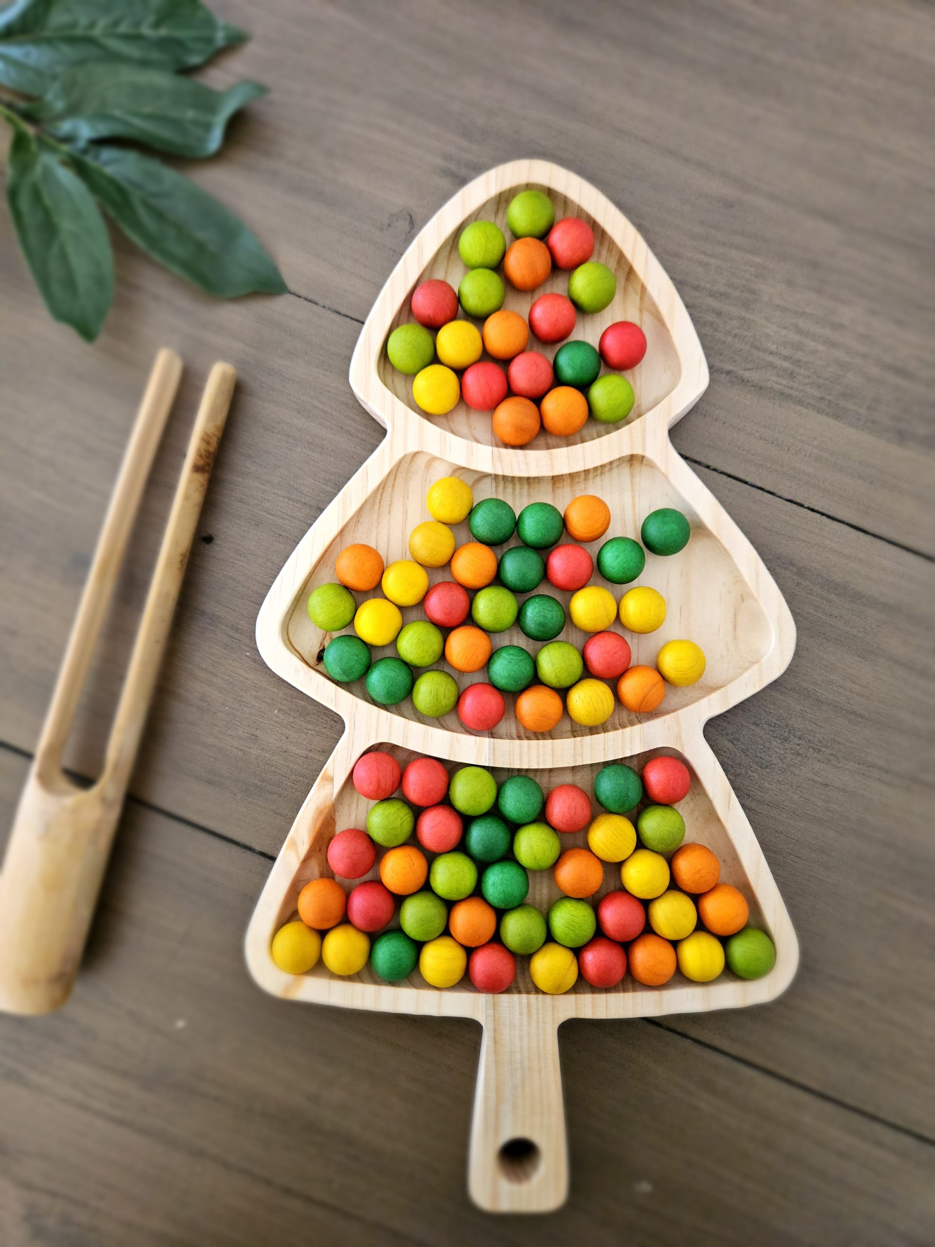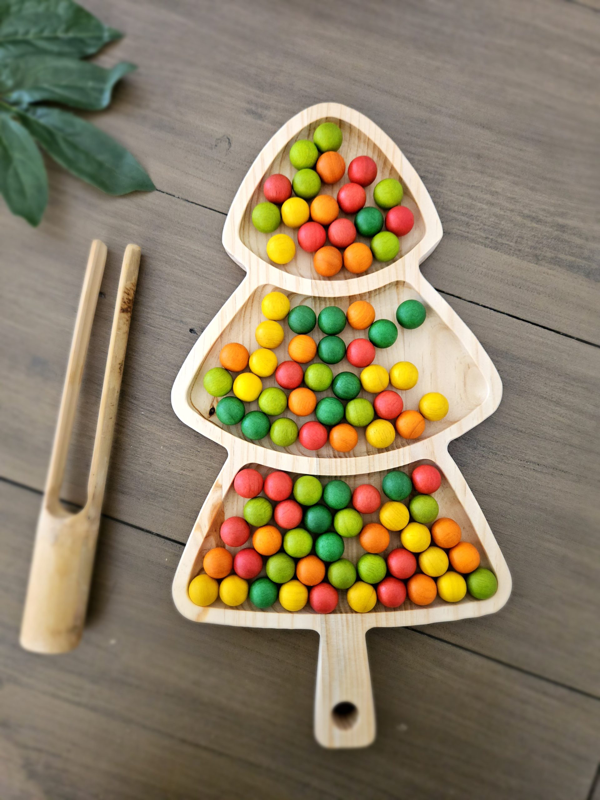 Celebrate the season while building essential skills! This festive wooden tray invites children to practice fine motor precision by using the bamboo tongs to place colorful spheres into the tree. A perfect blend of holiday cheer and developmental learning, this tray works as a counting game, a color sorter, or a beautiful centerpiece for a holiday play shelf.