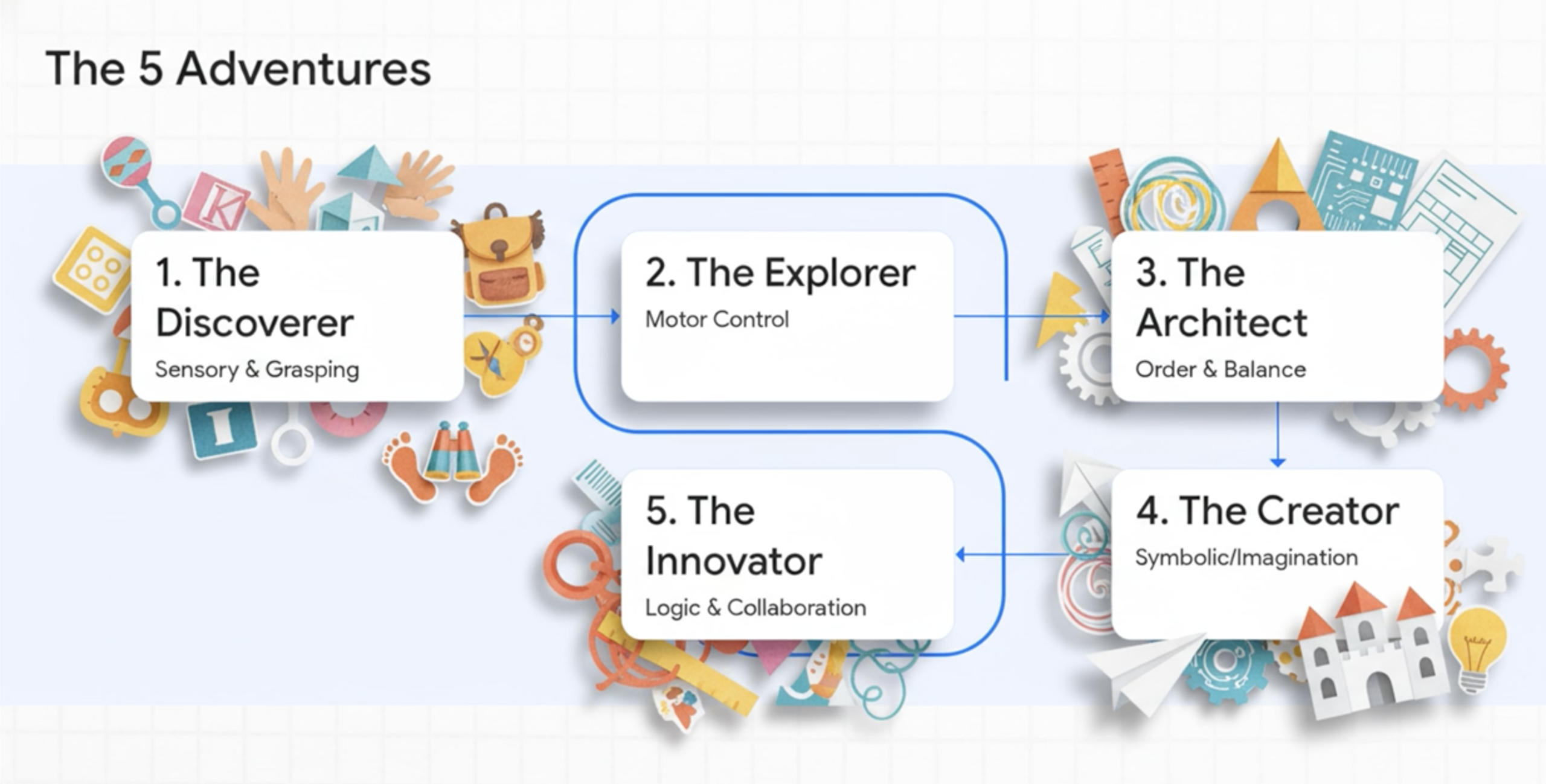 - The Discoverer (0–12m): The arc begins with sensory exploration and grasping. At this stage, a child needs to understand object permanence and texture.